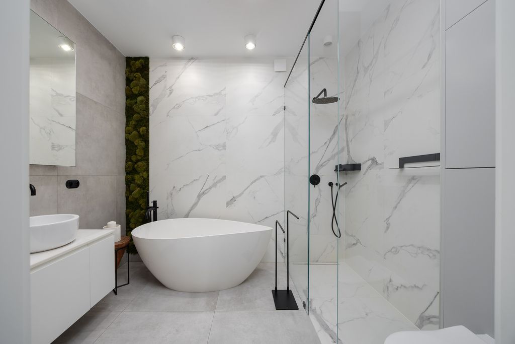 - W łazience znajdują się zarówno wolnostojąca wanna, jak i przestronna kabina prysznicowa typu walk-in, co zapewnia pełną wygodę i elegancję codziennego użytkowania.