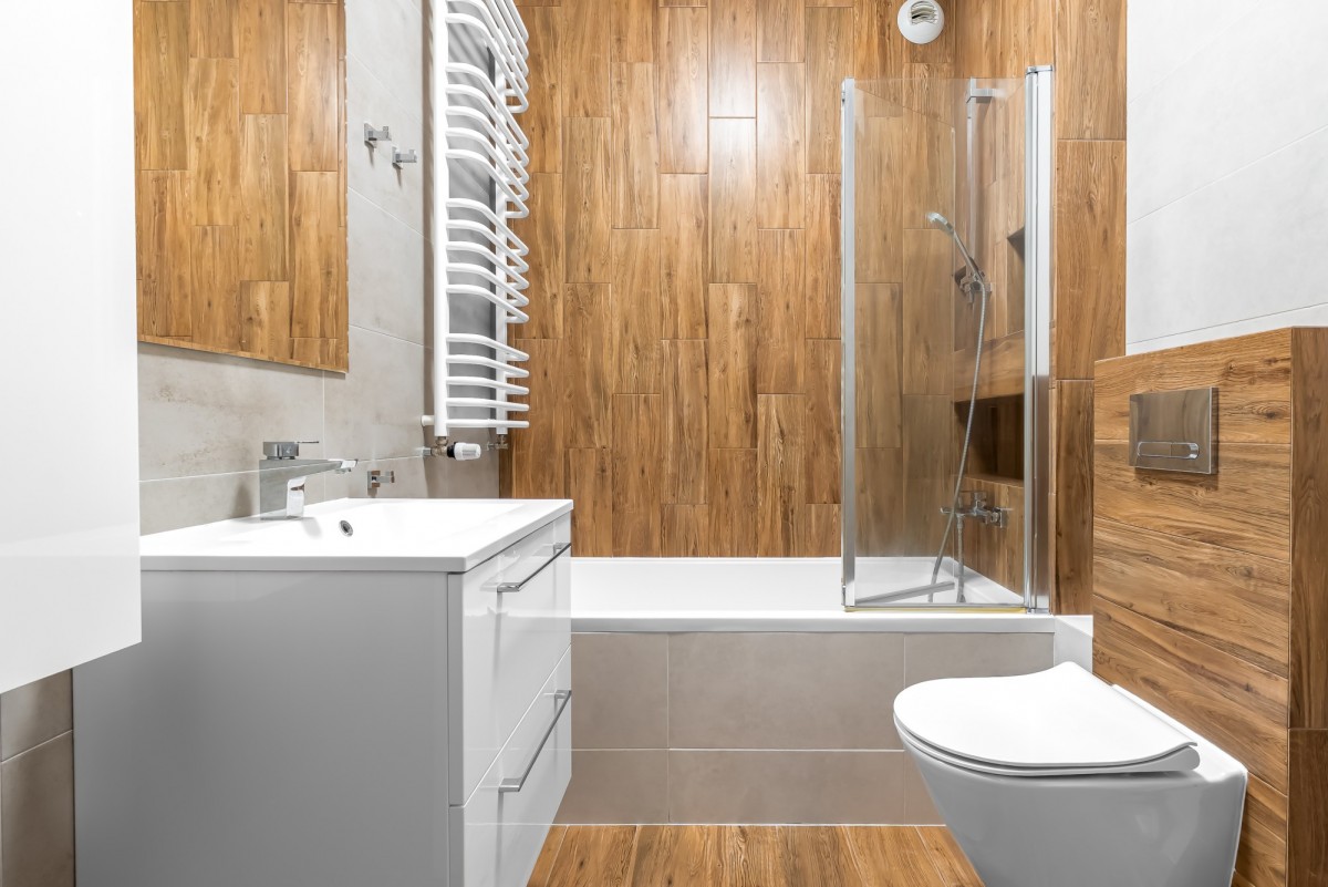 - Łazienka z wanną wykończona w eleganckim stylu, zgrywająca się z resztą mieszkania.