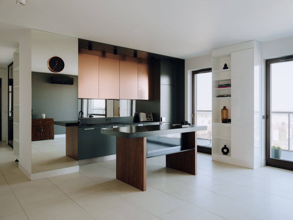 The apartment was finished with great attention to detail, using natural materials such as wood veneer, stone and metal. The kitchen and built-in wardrobes were custom-made. Large panoramic windows ensure excellent natural light, while the tall interior doors enhance the feeling of space and elegance. The apartment is equipped with air conditioning and designer lighting.