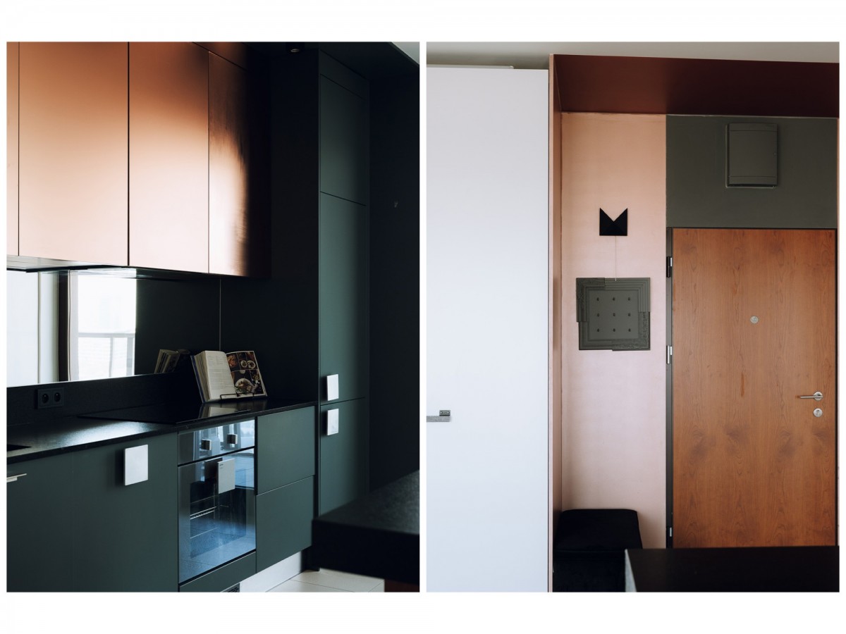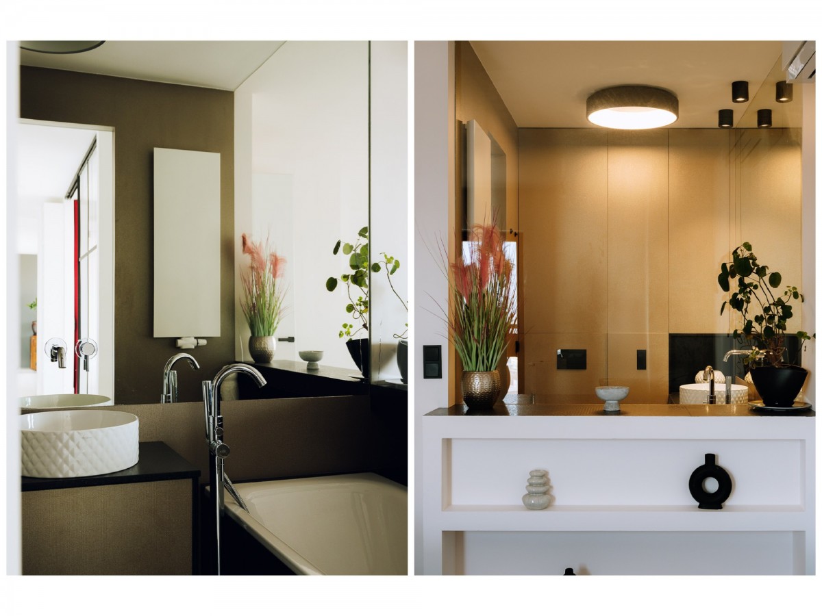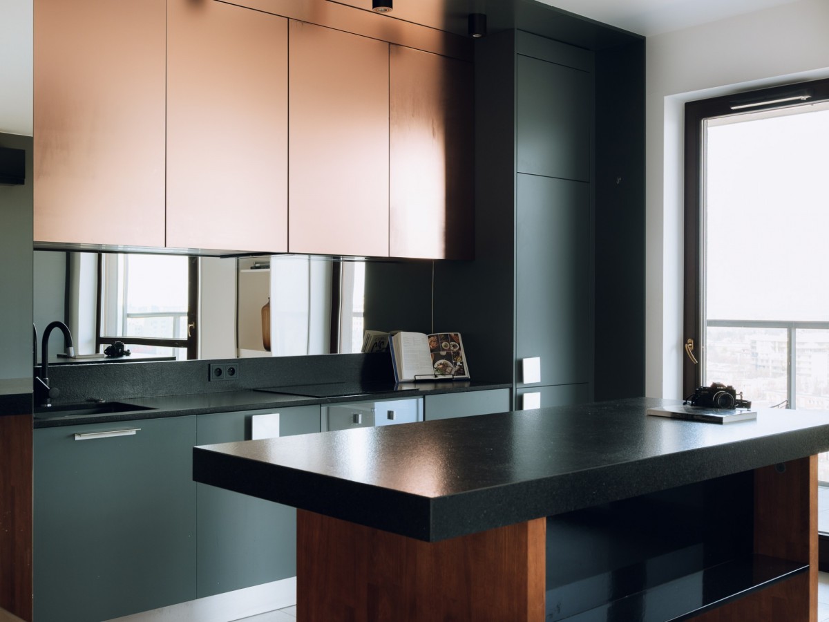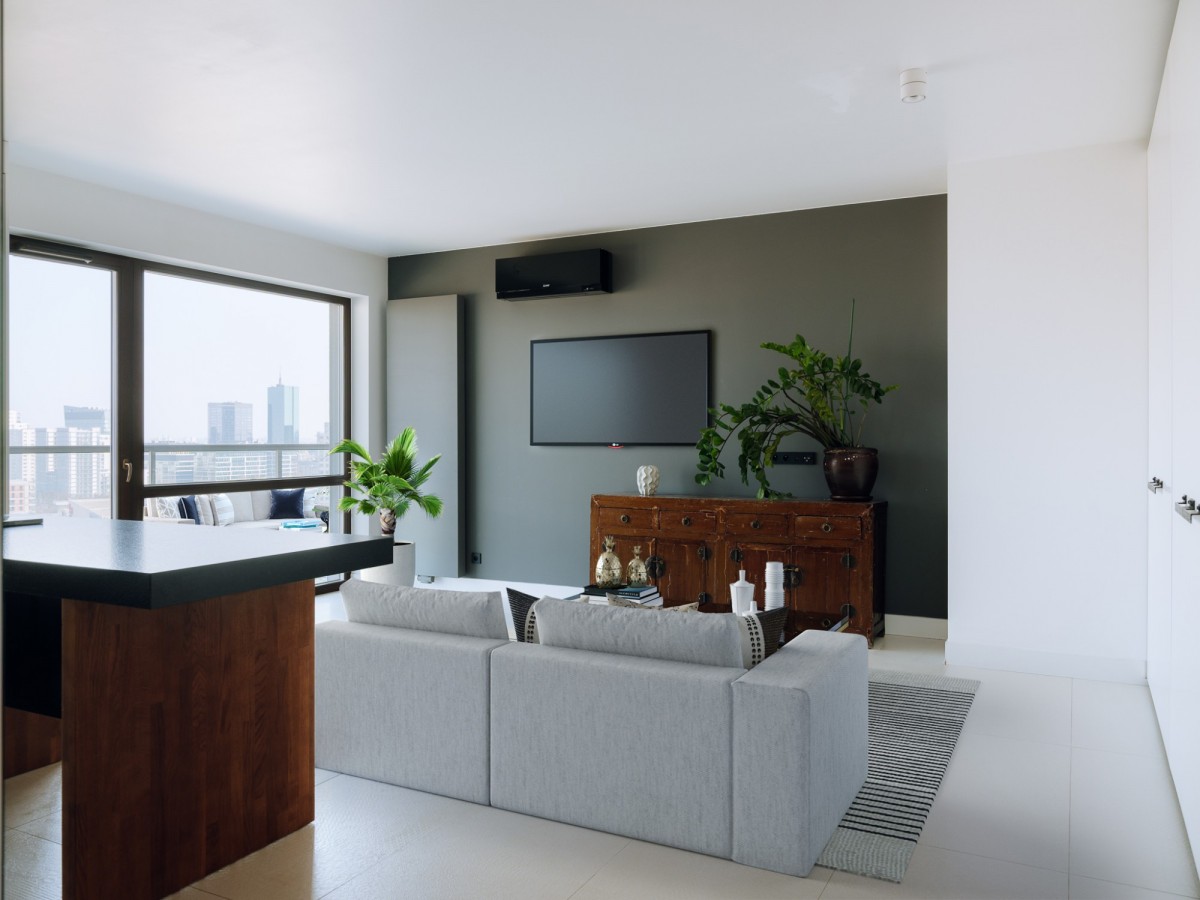 Mieszkanie zostało wykończone z dbałością o detale — z użyciem naturalnych materiałów, takich jak fornir, kamień i metal. Zabudowa kuchni i szafy zostały wykonane na zamówienie. Panoramiczne okna zapewniają doskonałe doświetlenie wnętrz, a wysoka stolarka drzwiowa dodatkowo potęguje wrażenie przestrzeni i elegancji. Apartament wyposażony jest w klimatyzację oraz nowoczesne oświetlenie.