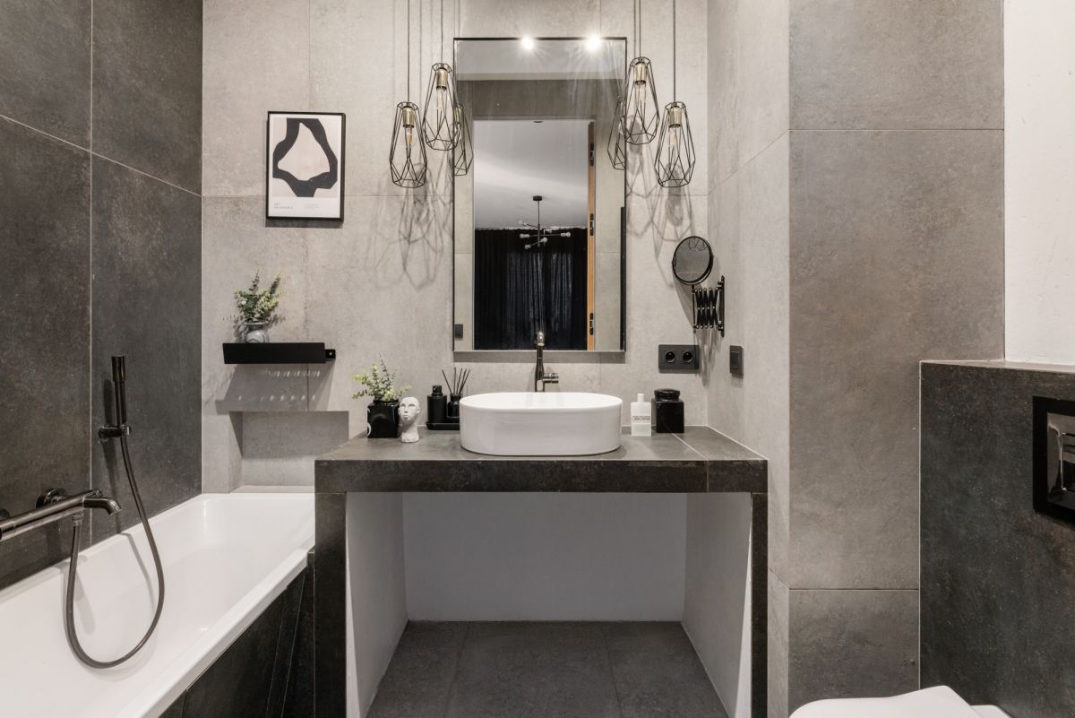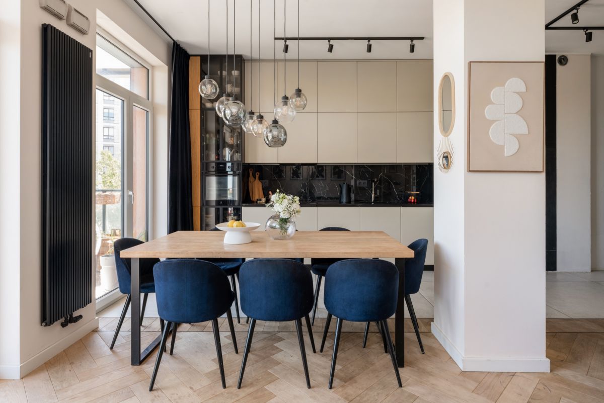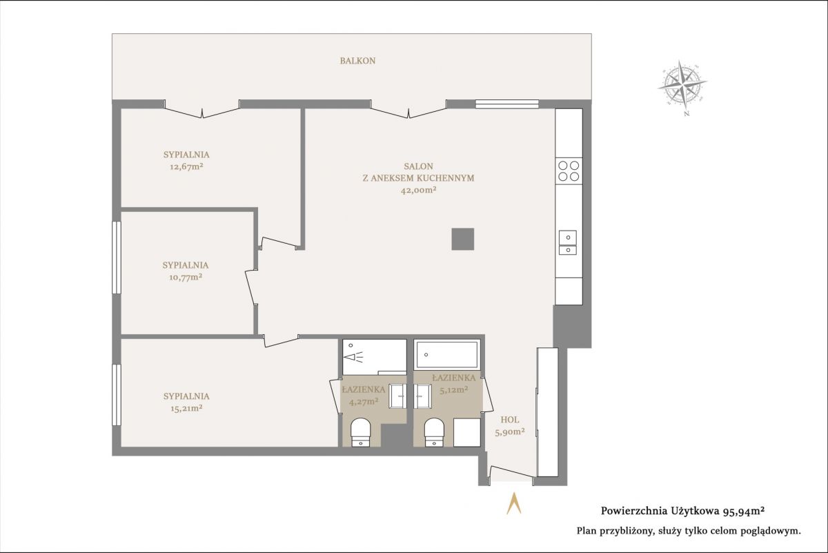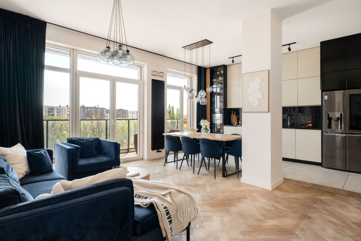 Apartament ma powierzchnię 95 m2 i posiada funkcjonalny układ z podziałem na część dzienną i prywatną. W części dziennej mamy salon ze strefą wypoczynkową otwartą na kuchnię i jadalnię, w której znajduje się stół z 8 krzesłami oraz łazienkę z prysznicem. Dzięki wysokim oknom oraz wysokości 3 m, mieszkanie jest bardzo dobrze doświetlone światłem naturalnym. Z salonu mamy wyjście na duży balkon (18 m2).