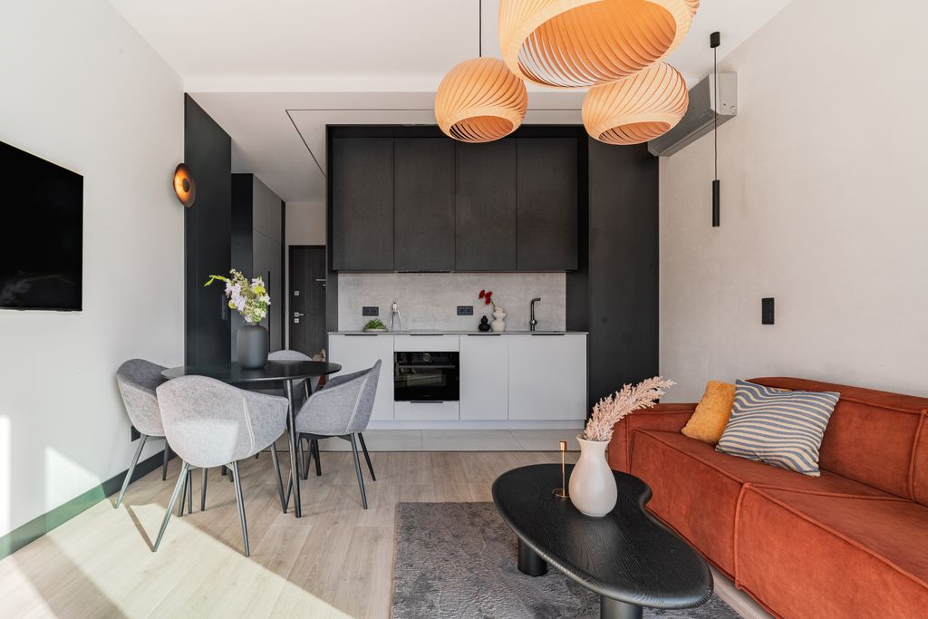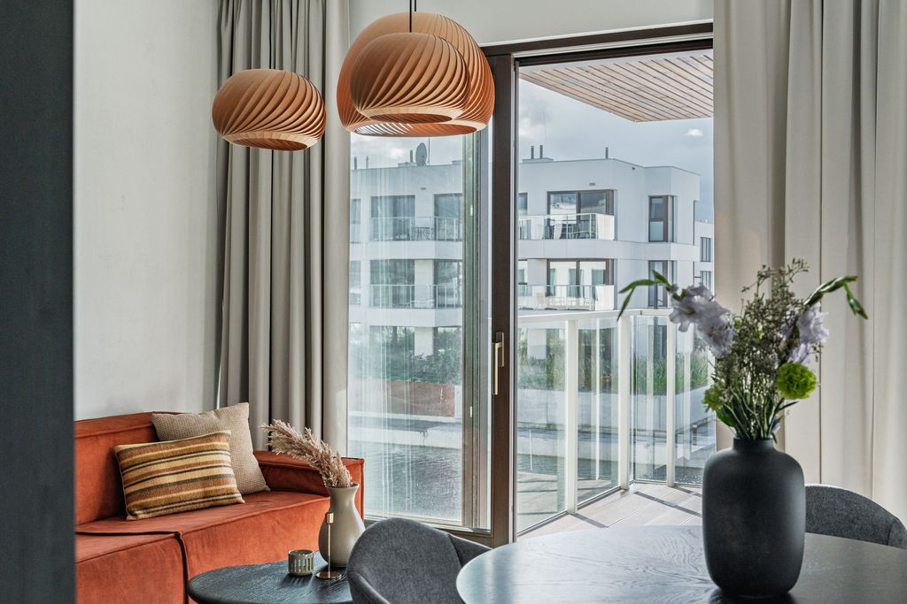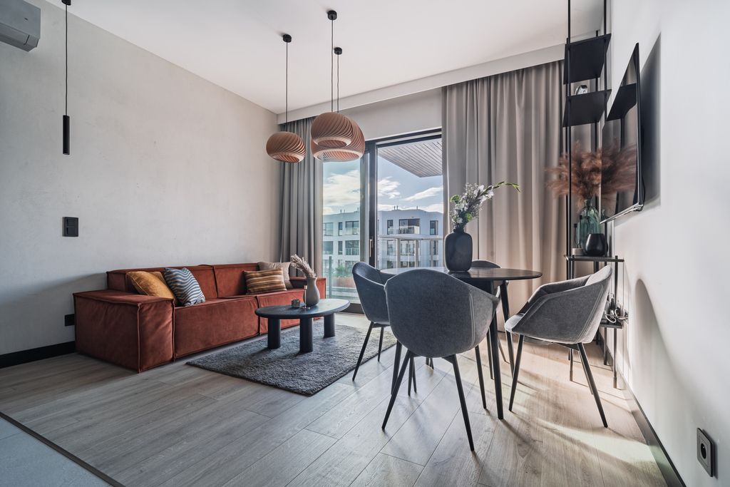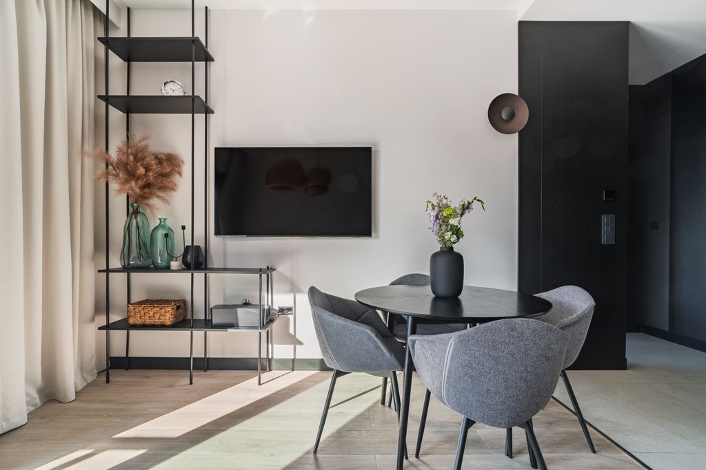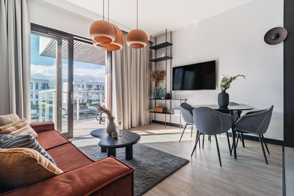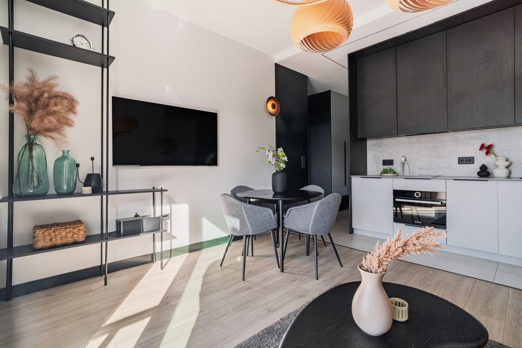 Standard wykończenia: mieszkanie wykonane z dbałością o detale, w całości wykończone i umeblowane. Dominują jasne kolory, drewno, tkaniny oraz odrobina kontrastującej czerni – wystrój w nowoczesnym stylu, łączący prostotę, elegancję i komfort.