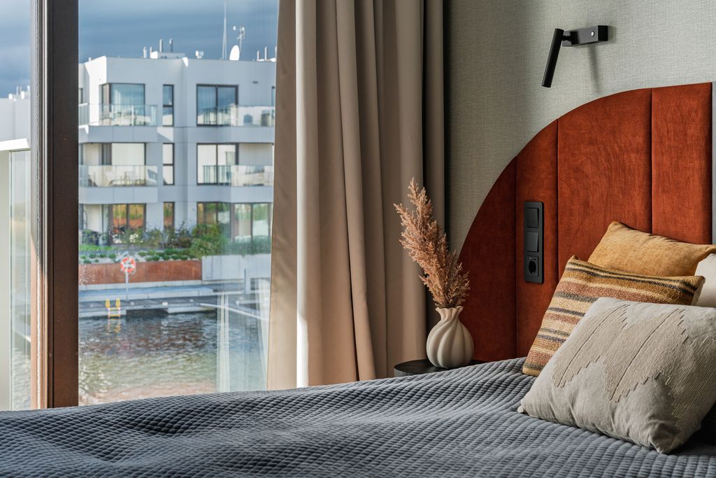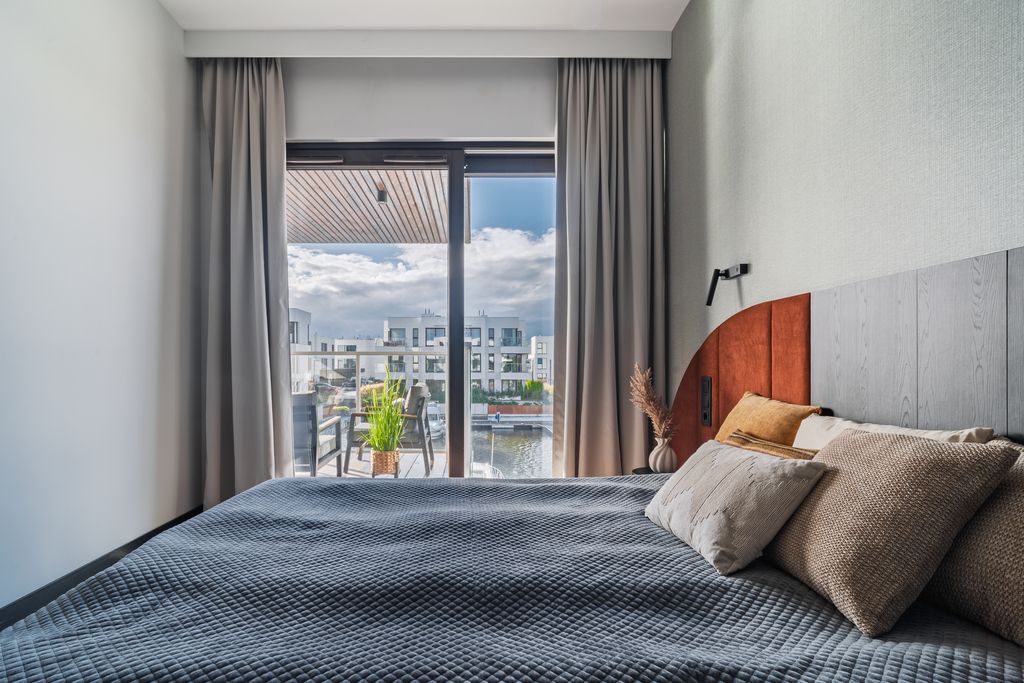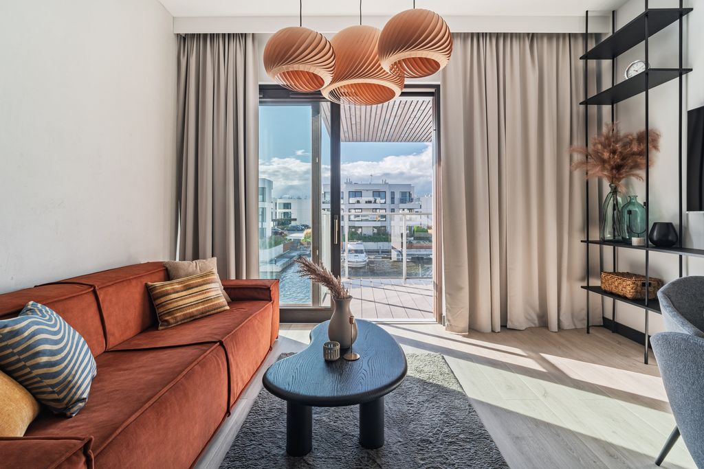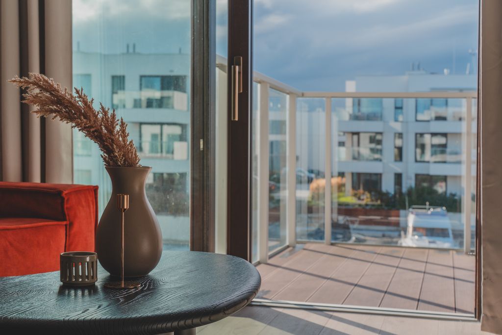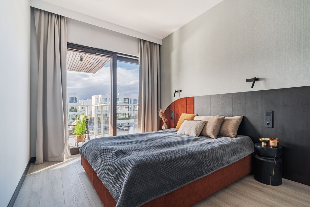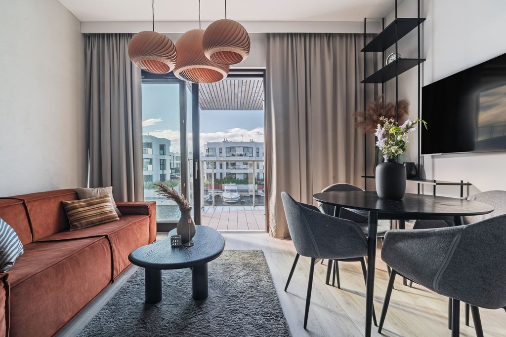 - Salon z aneksem kuchennym: jasna, otwarta przestrzeń z dużymi przeszkleniami i wyjściem na taras z widokiem na marinę. Aneks kuchenny w minimalistycznej zabudowie, wyposażony w wysokiej klasy sprzęt AGD. Ciepłe, naturalne barwy, miękkie tkaniny i drewniane akcenty wprowadzają harmonię i spokój charakterystyczne dla stylu Japandi.