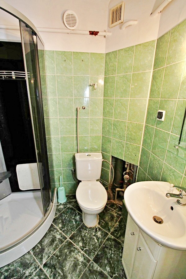 Duża kuchnia z oknem. Media-miejskie. Łazienka z kabiną prysznicową i WC.