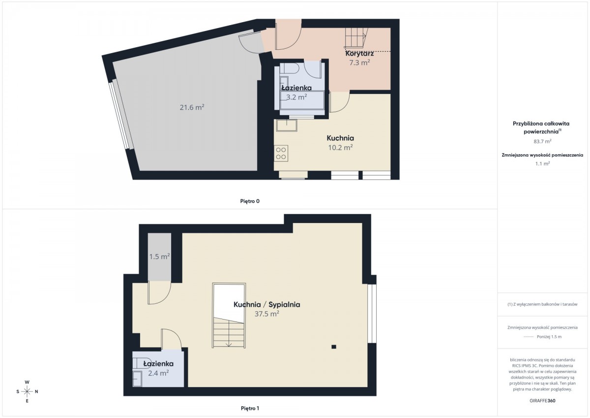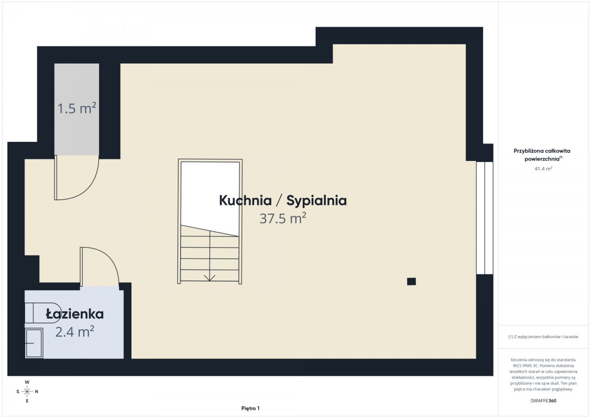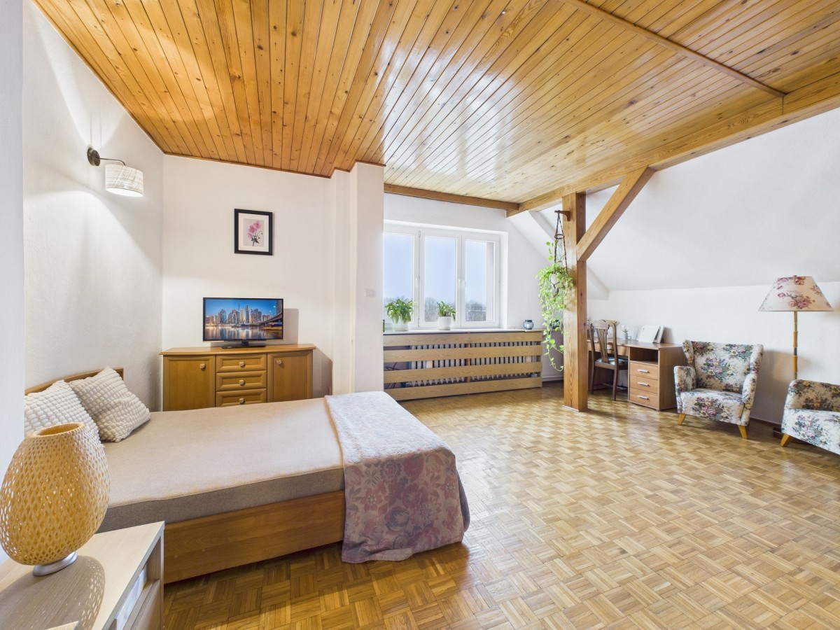 Drugi poziom to duża, otwarta przestrzeń z osobną łazienką, która daje szerokie możliwości aranżacyjne. Może pełnić funkcję klimatycznej sypialni typu loft, ale równie dobrze sprawdzi się jako przestronny gabinet, pracownia artystyczna, studio fotograficzne czy miejsce do pracy zdalnej. Dzięki wyraźnemu podziałowi kondygnacji istnieje realna możliwość wydzielenia dwóch niezależnych kawalerek - każdej z własną łazienką - co czyni nieruchomość atrakcyjną inwestycyjnie (np. pod wynajem długoterminowy lub krótkoterminowy).