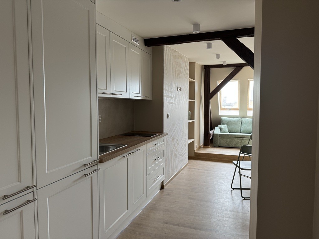 Kuchni w formie aneksu z meblami na wymiar ze sprzętem AGD (duża lodówka z zamrażarką z szufladami, kuchenka elektryczna, okap)