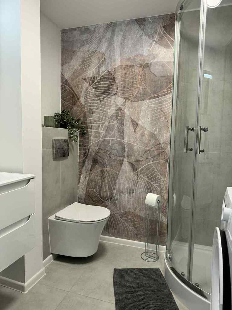 w łazienkach zamontowano biały montaż, armaturę i kabiny prysznicowe, położono płytki oraz zastosowano akcenty ozdobne z tapet,