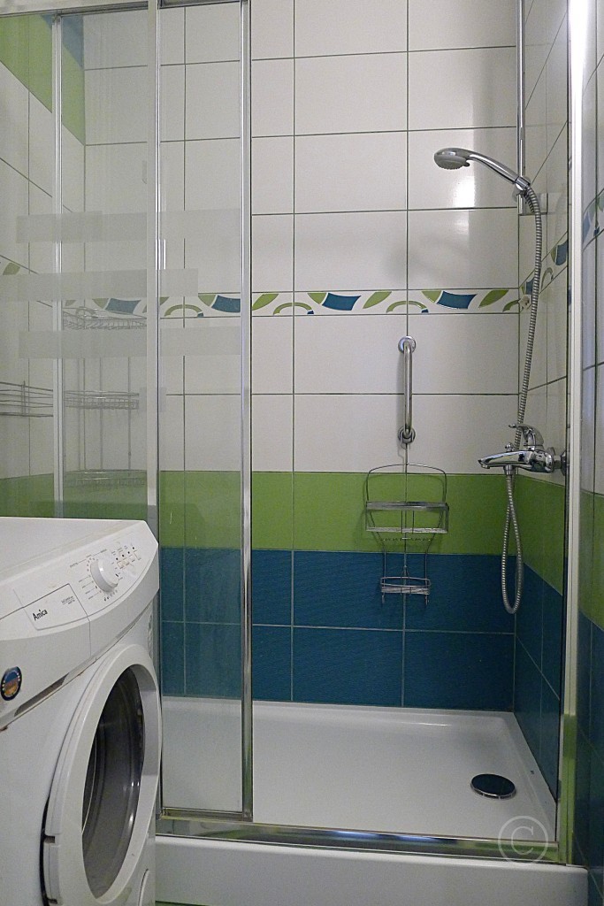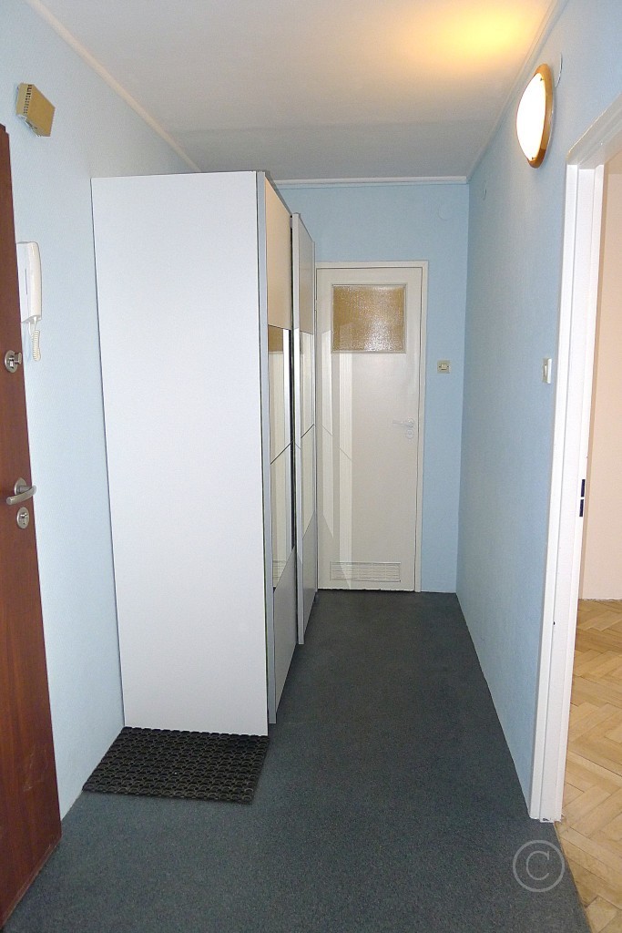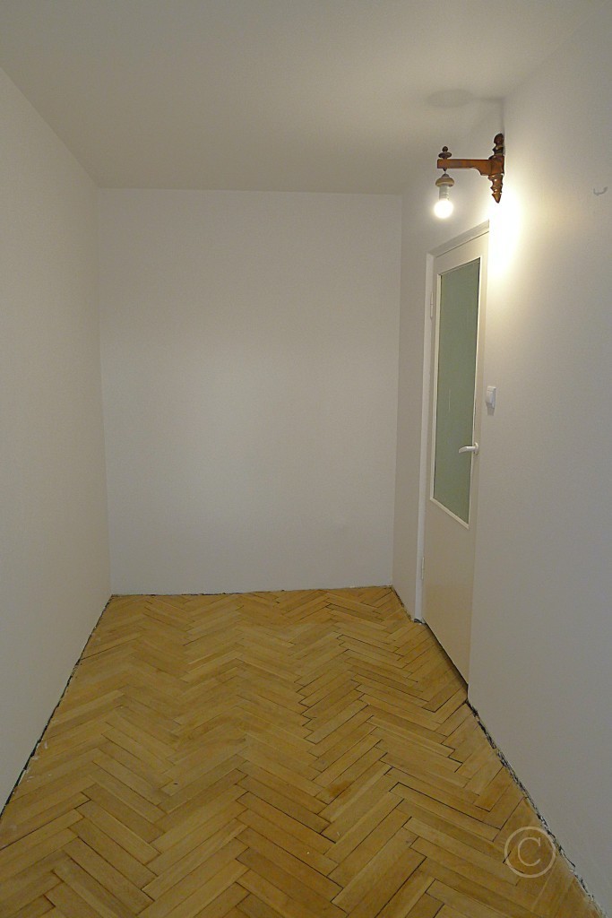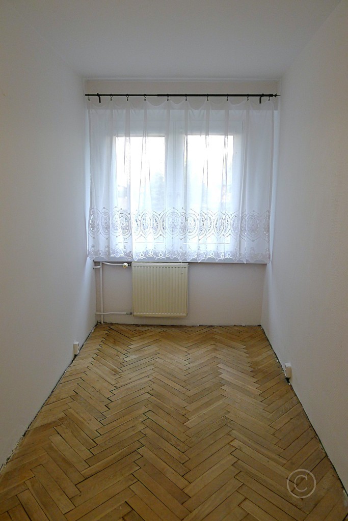 W pokojach na podłodze parkiet, na ścianach gładź gipsowa, malowana oraz tapeta, w kuchni na podłodze wykładzina PCV, na ścianach glazura, w łazience z WC na podłodze terakota, na ścianach glazura, kabina prysznicowa, WC częściowo oddzielone ścianką, pralka. W przedpokoju duża szafa, na podłodze wykładzina, na ścianach tapeta. Do kuchni wejście przez duży pokój. Mały pokój w rozkładzie (wejście z przedpokoju).