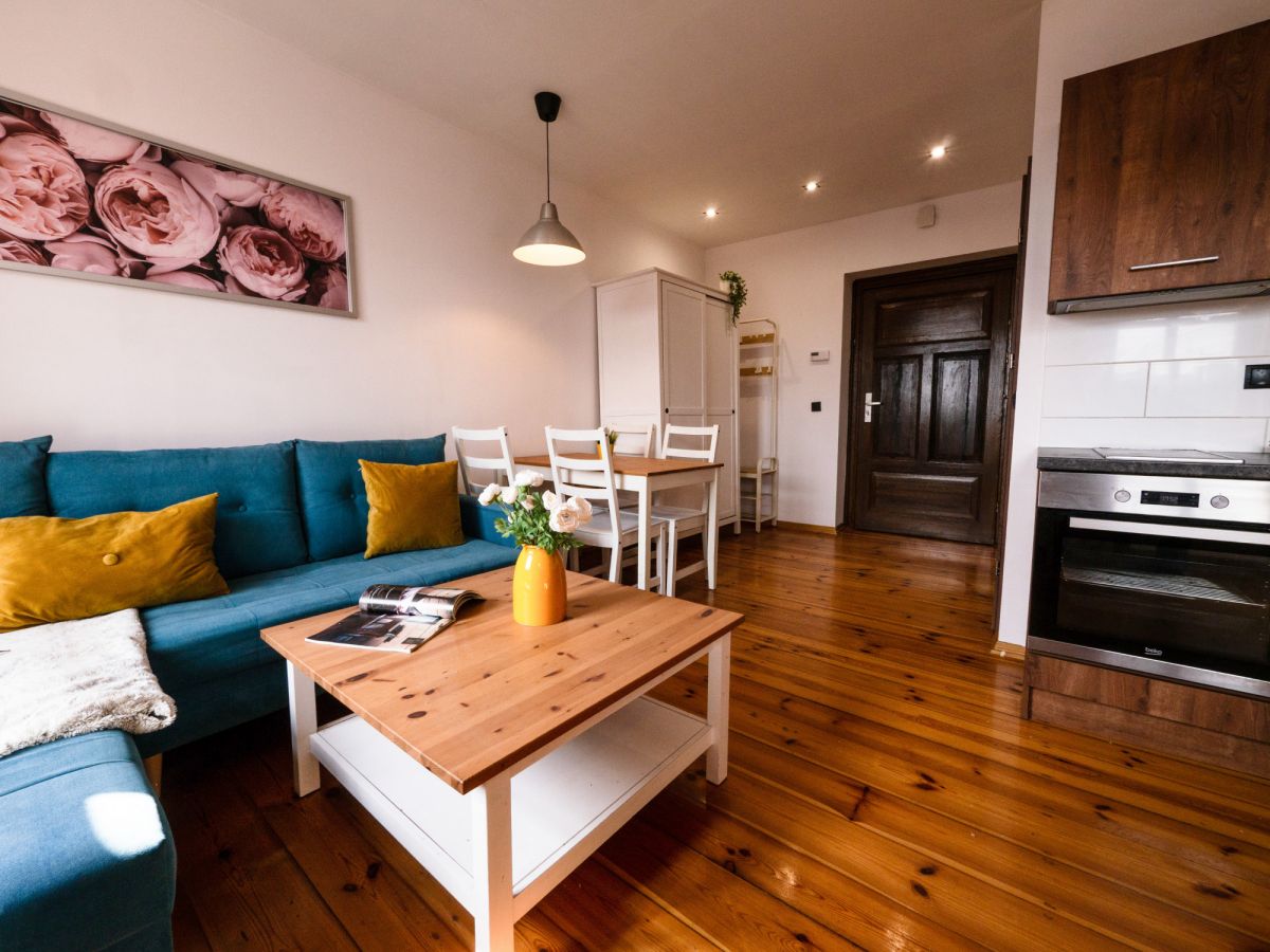 pokój z aneksem kuchennym i wygodnym narożnikiem,