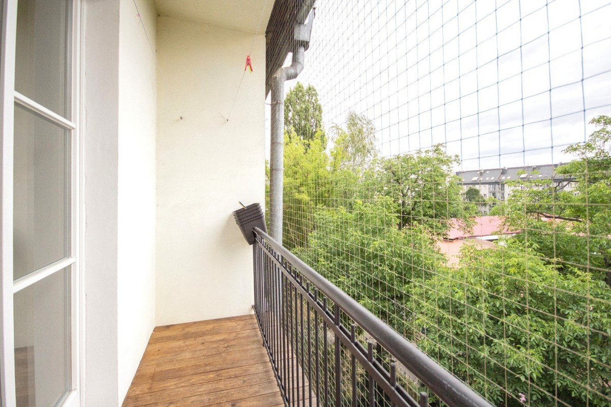 Z salonu wychodzi się na uroczy balkon z południową ekspozycją, na spokojne, zielone patio — idealne miejsce na kawę, rośliny i chwilę wytchnienia.