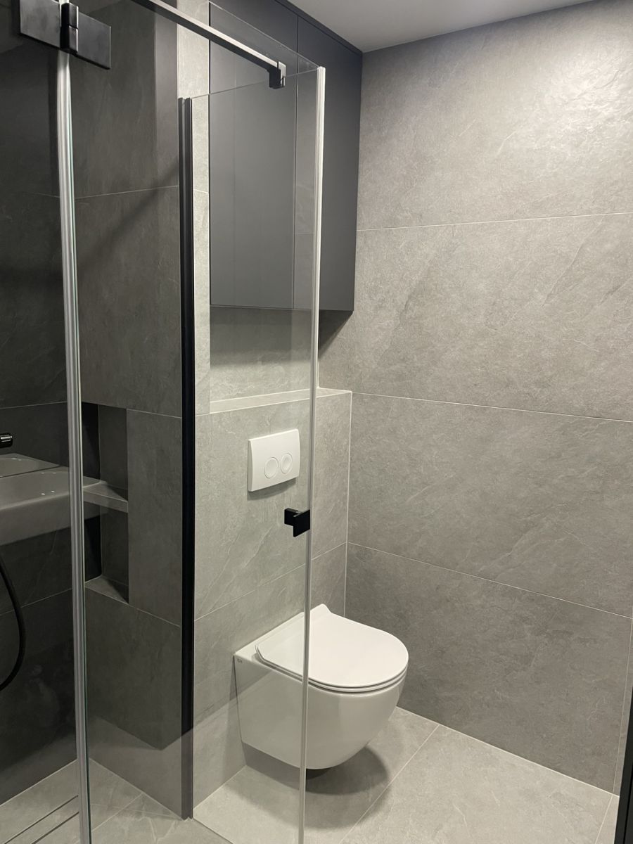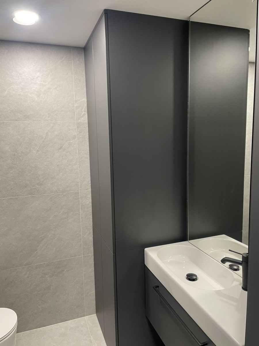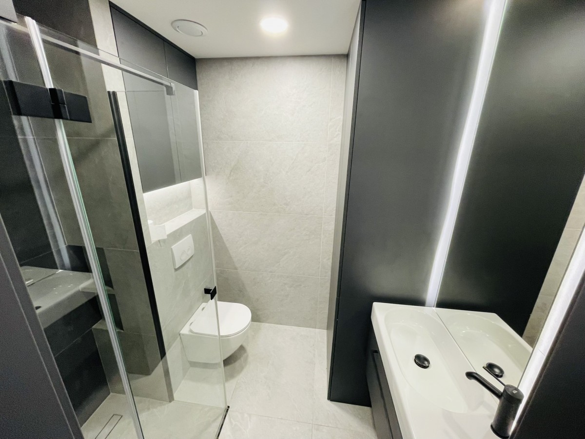 - łazienka: prysznic, pralka, dużo miejsca do przechowywania w zabudowie, szafka z umywalką, lustro