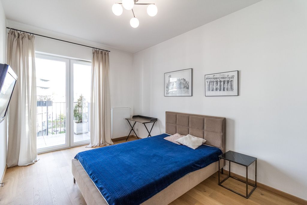 Mieszkanie jest rozkładowe, o wysokim standardzie wykończenia. Posiada otwartą kuchnię z pełnym wyposażeniem, w tym lodówkę, pralkę, zmywarkę oraz piekarnik. Dwie łazienki są w pełni wyposażone, co zwiększa komfort codziennego życia. Pokoje są umeblowane, a okna wychodzą na wschód oraz zachód, co zapewnia dobre doświetlenie.