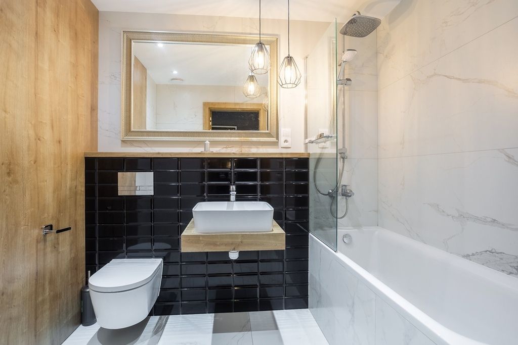 Łazienka wyposażona jest w wannę, prysznic, pralkę, WC, umywalkę oraz grzejnik drabinkowy. Do mieszkania przynależy balkon francuski.