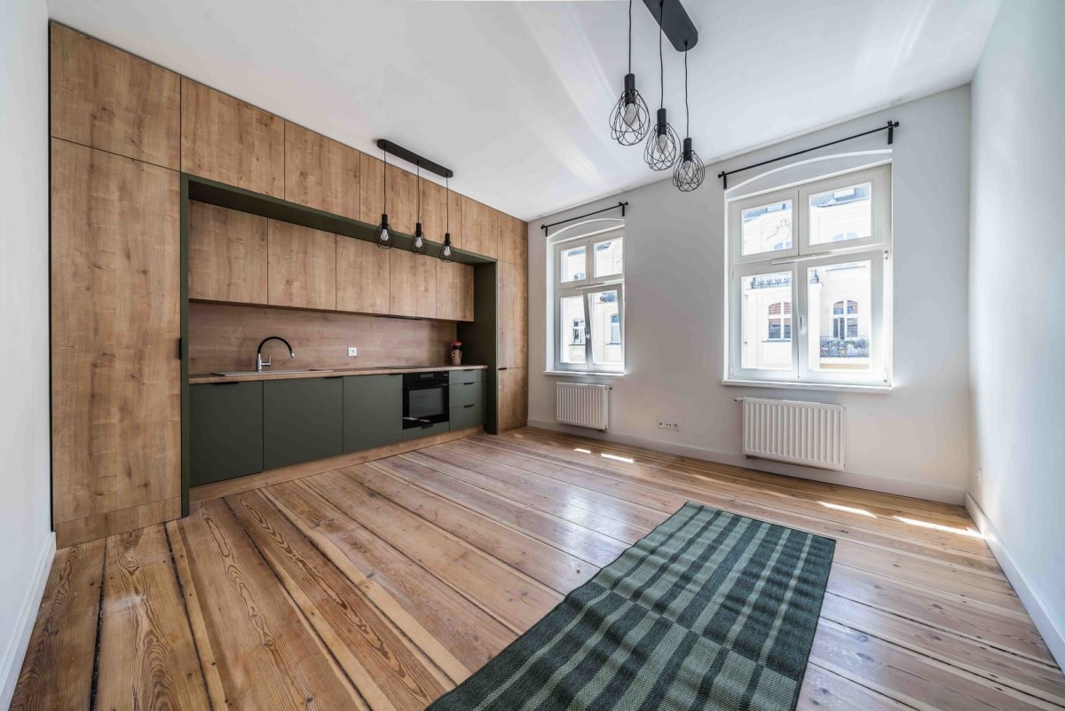 * zachowane oryginalne elementy kamienicy: zabytkowe drewniane podłogi (tam gdzie możliwe), oryginalne okładziny/cegły na ścianach