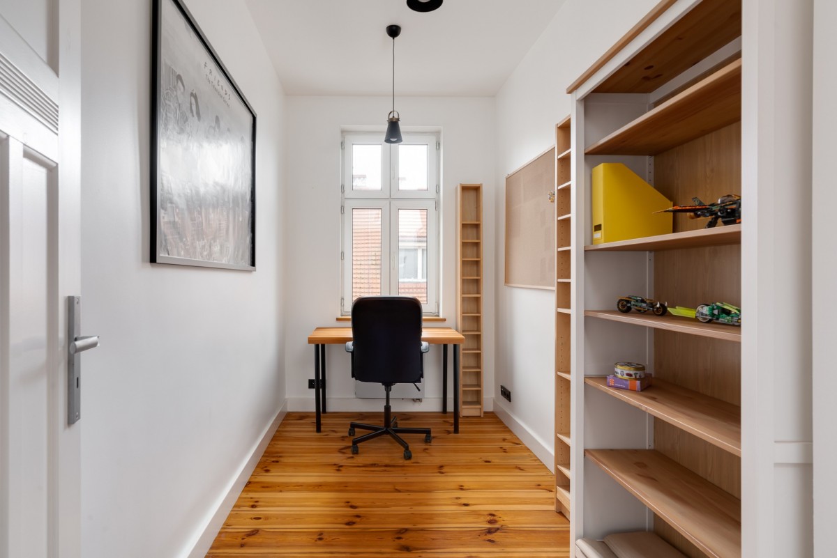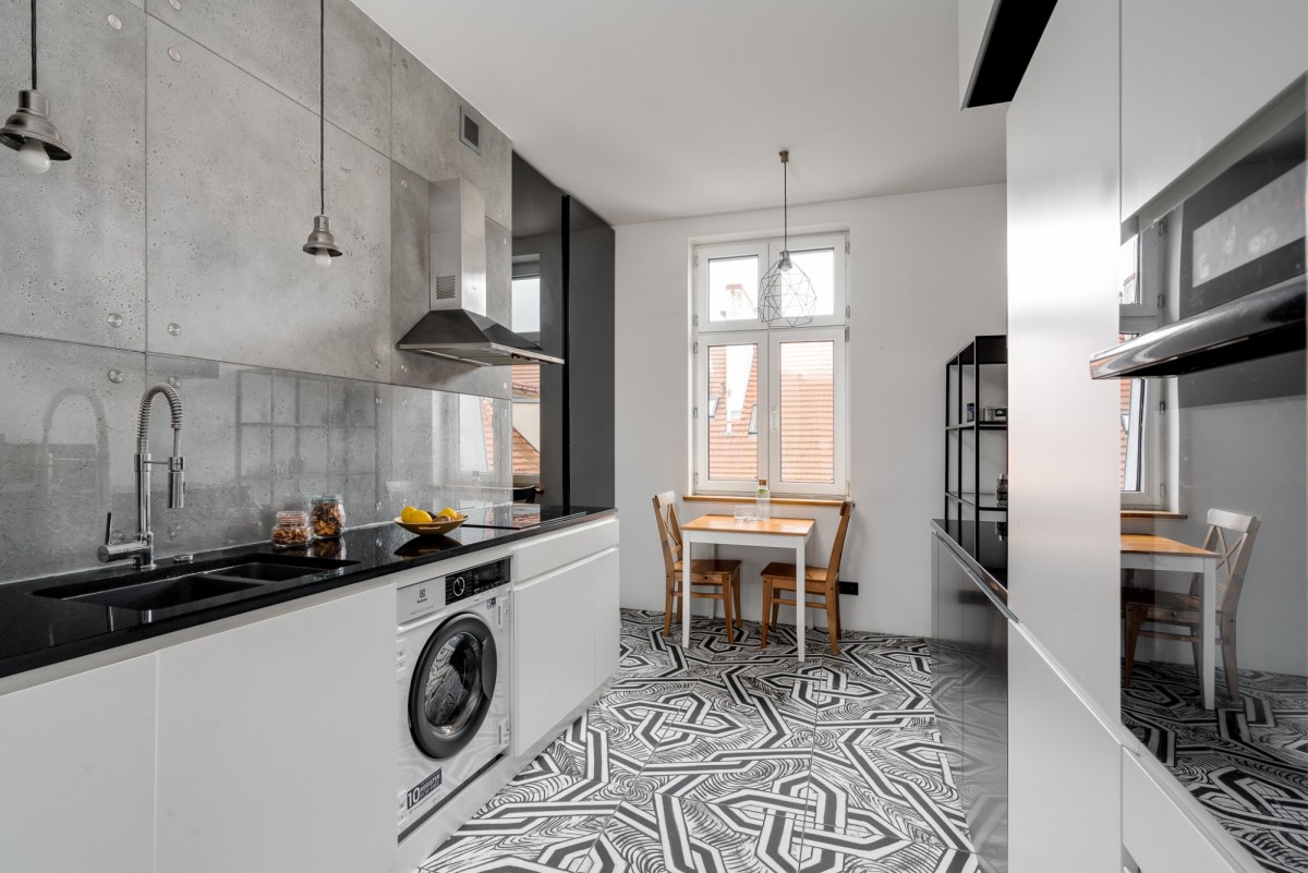 Mieszkanie jest częściowo umeblowane. W kuchni: meble kuchenne w zabudowie, półki, stół z krzesłami, sprzęt AGD (lodówka, płyta indukcyjna, piekarnik, zmywarka, mikrofalówka, pralka). W łazience: prysznic, szafka w zabudowie, piec dwufunkcyjny. W gabinecie: biurko, krzesło, regał na książki. W salonie: szafka pod RTV. W sypialni: dwie szafki nocne.