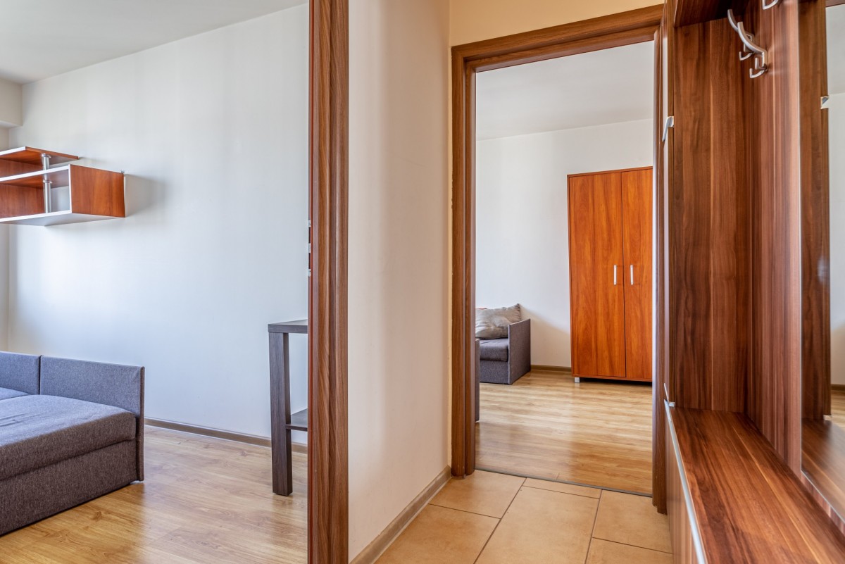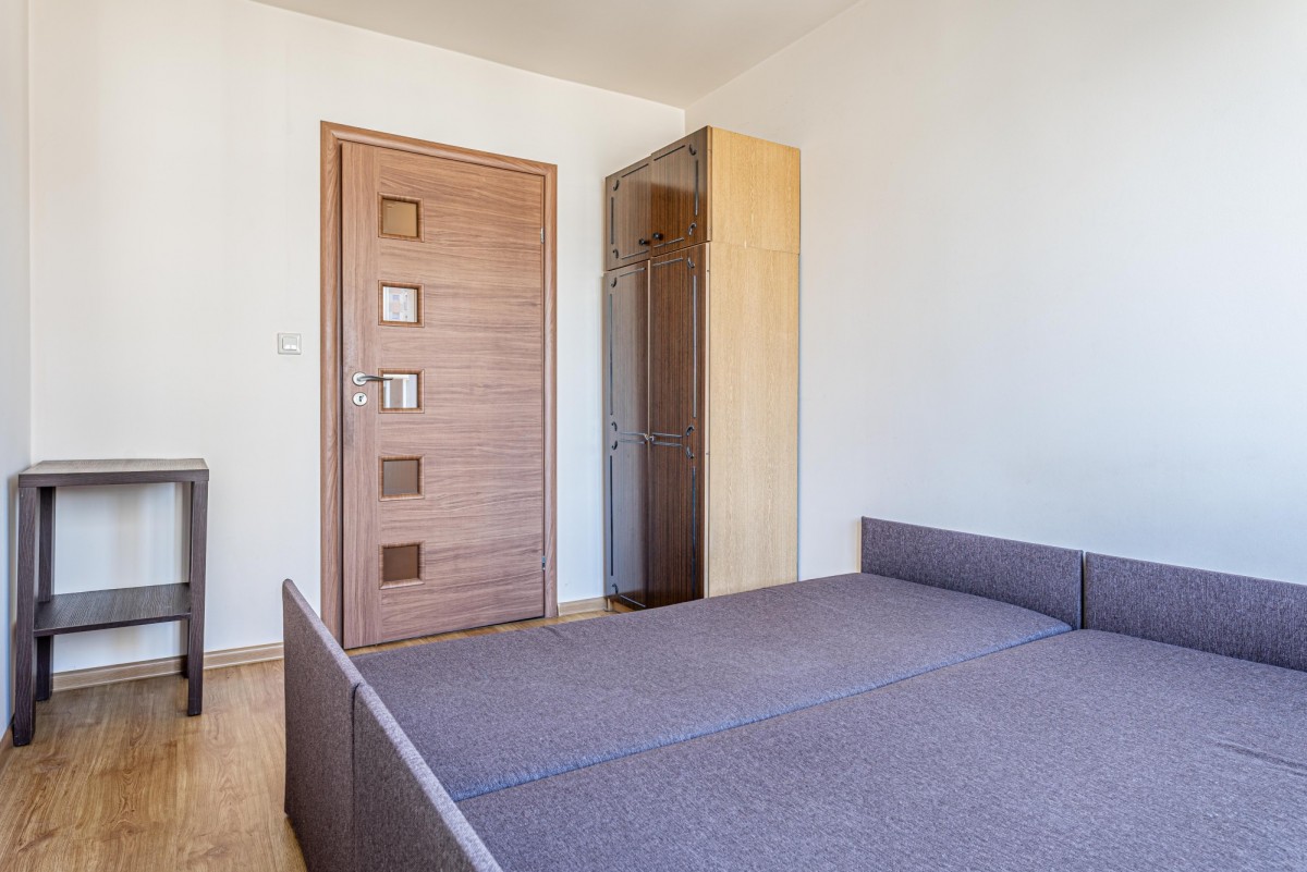 Pokój 2 (większy): 2 kanapy z funkcją spania, biurko, szafa oraz stolik RTV z miejscem do przechowywania.