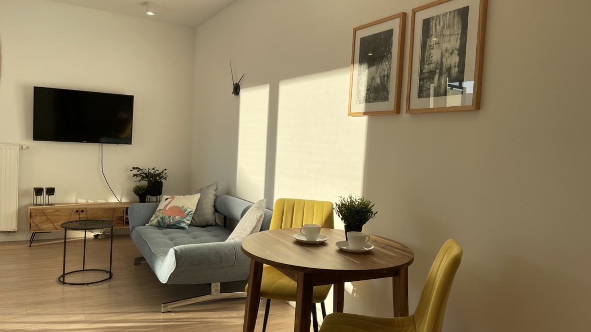 ✔ Salon wyposażony w kanapę rozkładaną, TV, stół z 2 krzesłami,