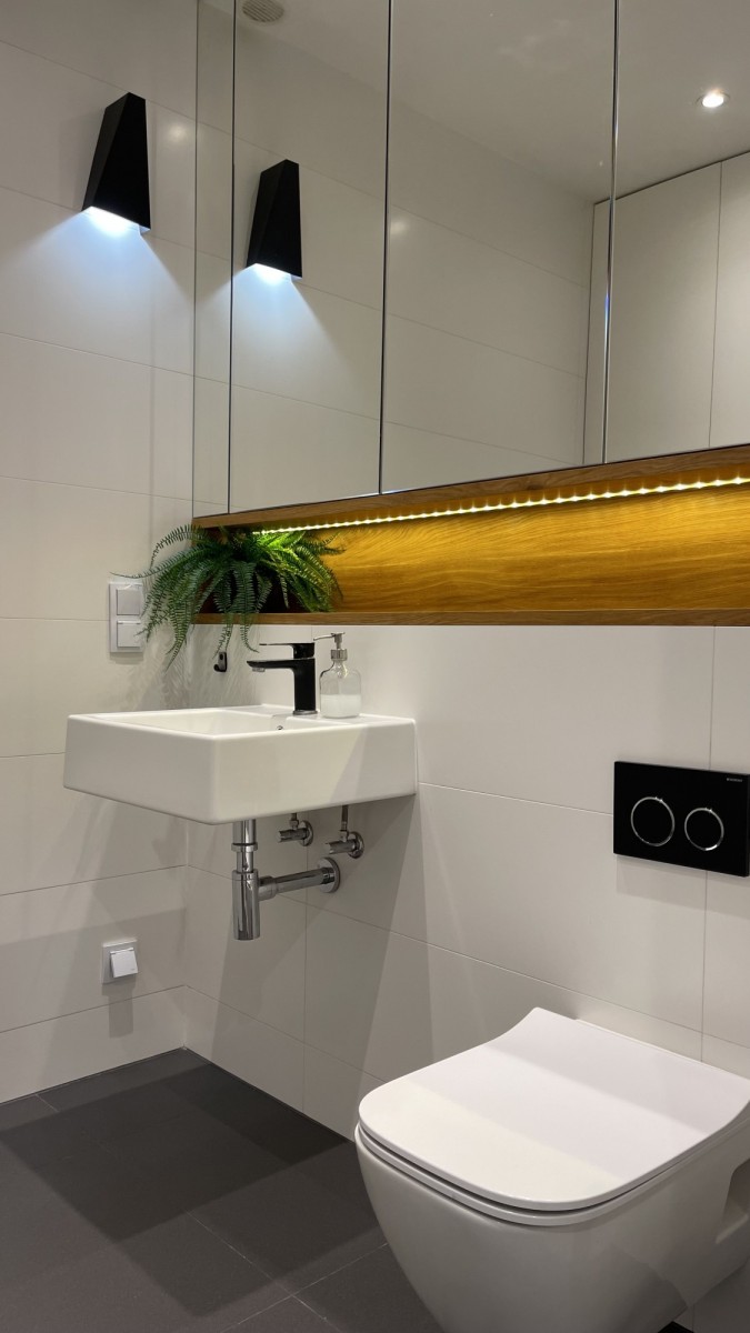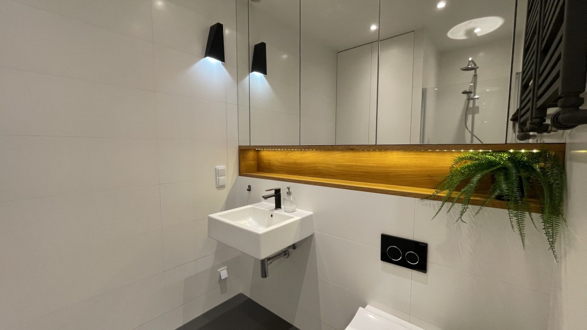 ✔ Nowoczesna łazienka - toaleta i umywalka w zabudowie, pojemne szafki z lustrami, prysznic w zabudowie oraz pralka ukryta w zabudowie z dodatkowymi półkami.