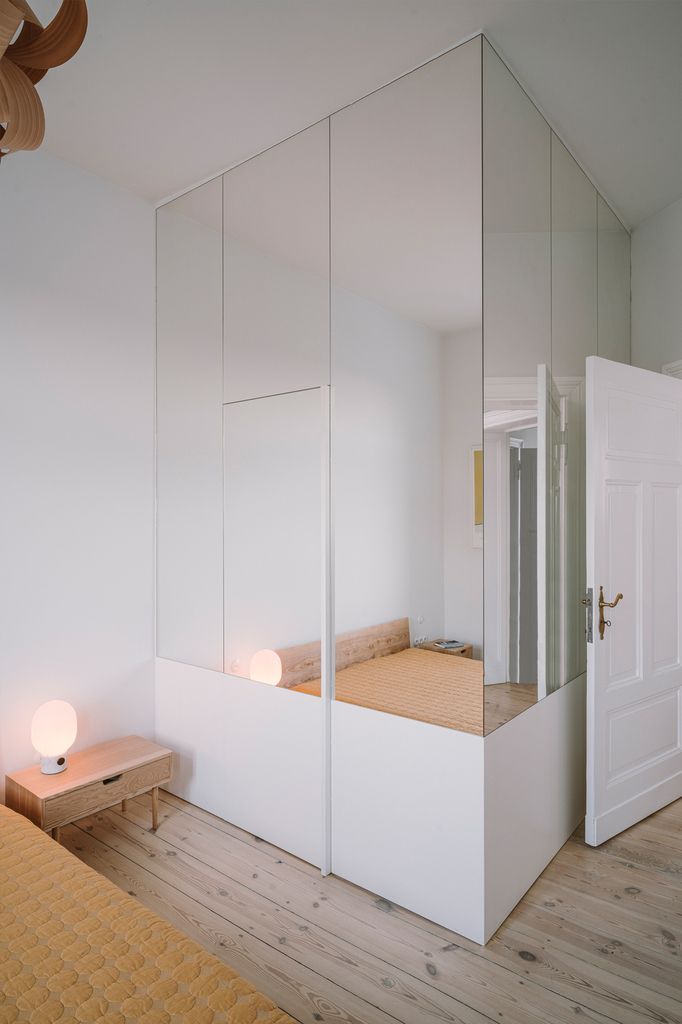 Sypialnia znajduje się od strony podwórka i ma prywatną łazienkę oraz komfortową garderobę z wieloma szafkami i drążkami na wieszaki.