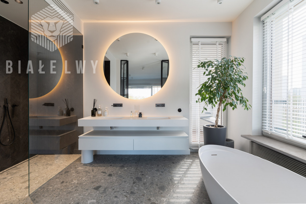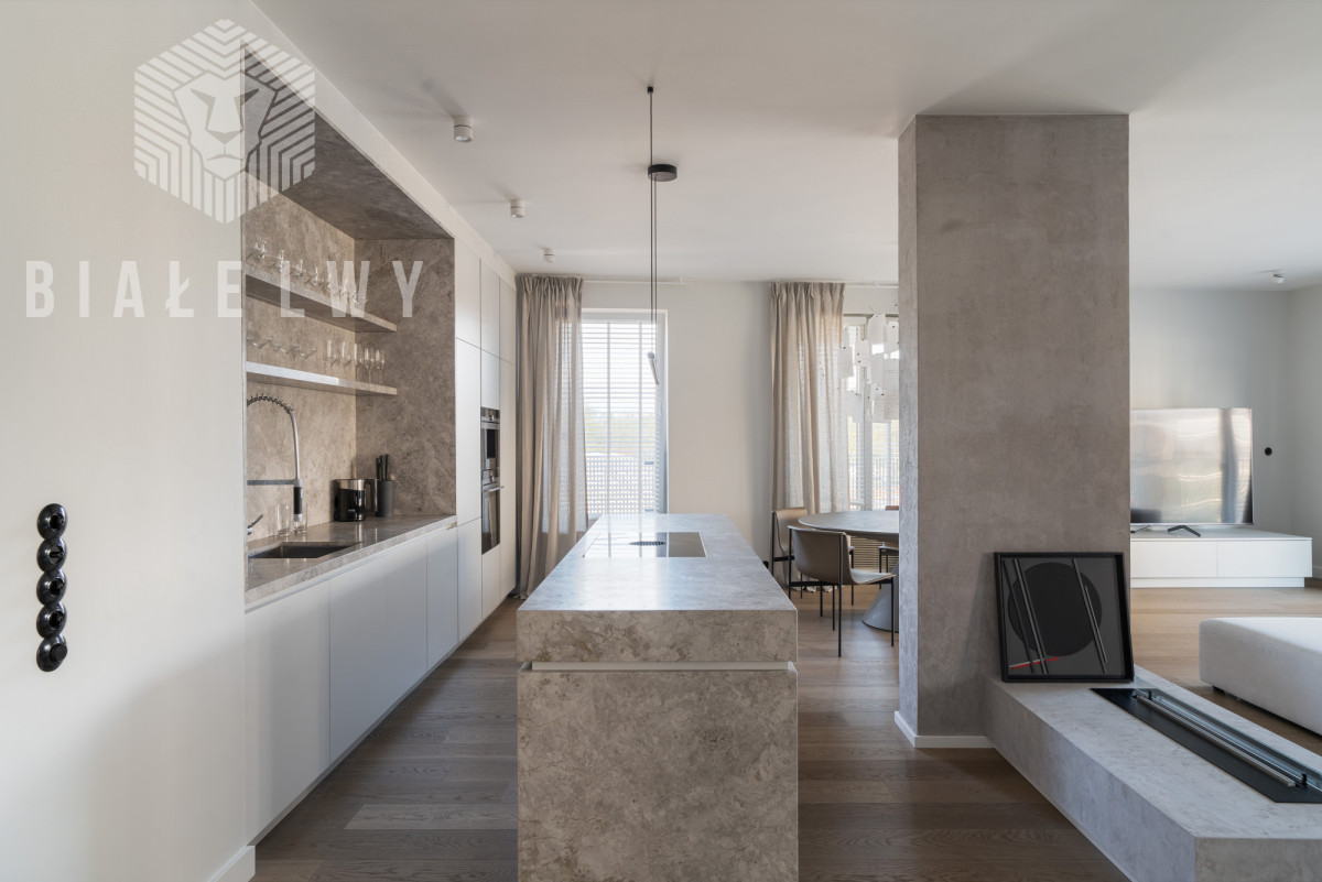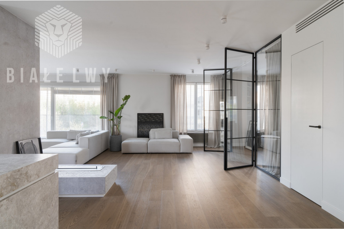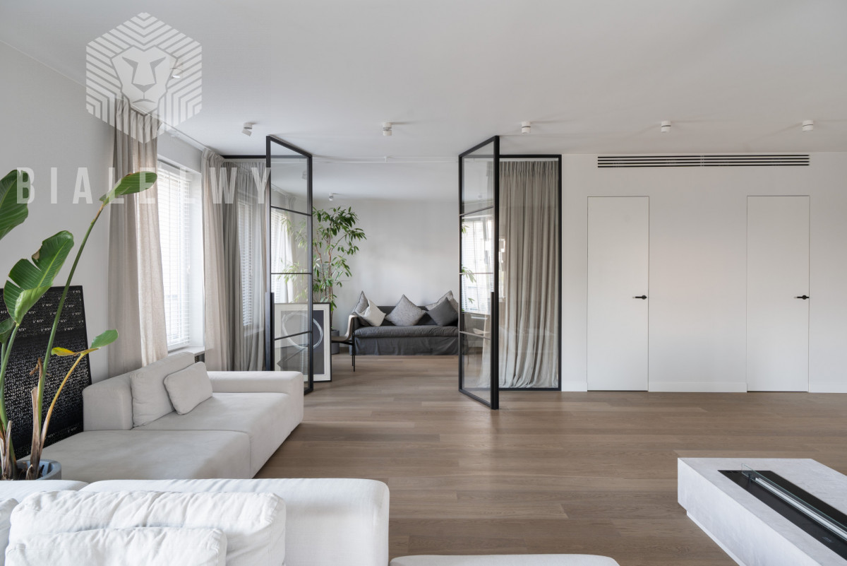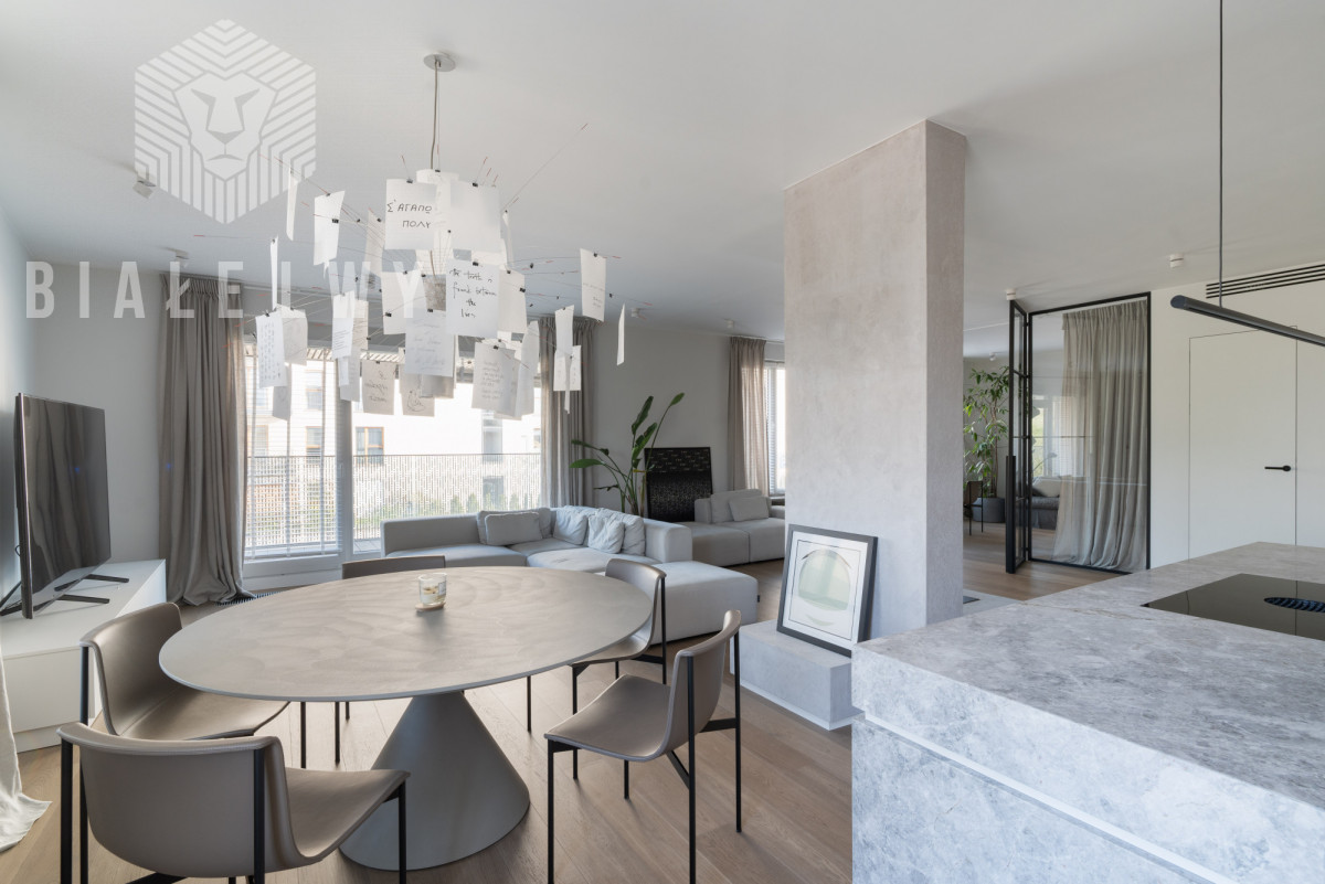 In the Mokotów district on Eukaliptusowa Street, there is an elegant, classy apartment with an area of 147 m² and three balconies.