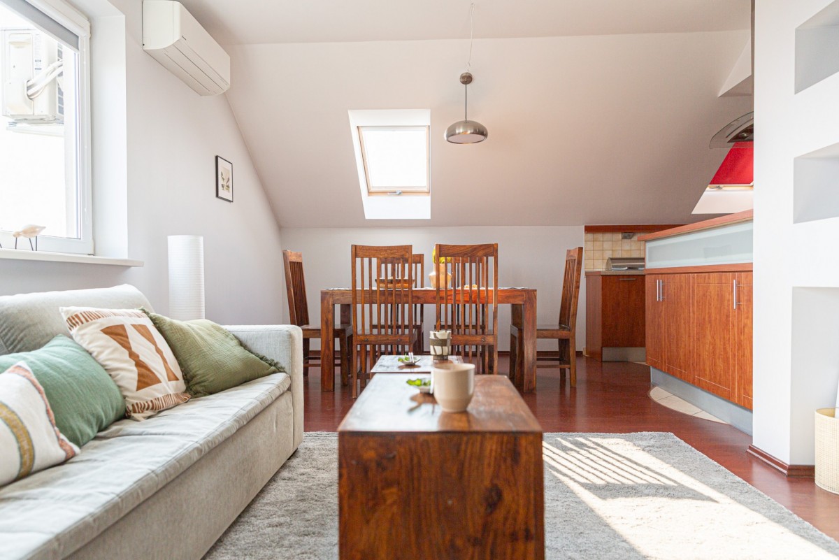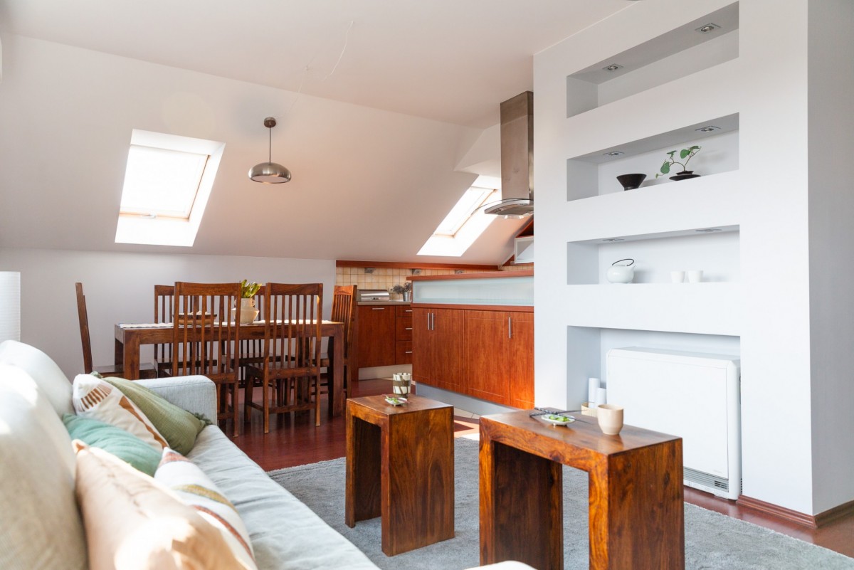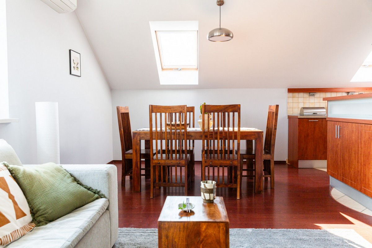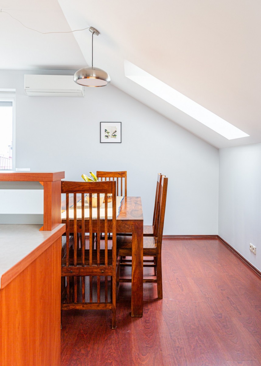 Jadalnia w salonie, z oknem połaciowym: