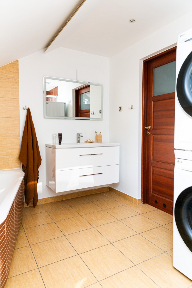 Na dole jest duży klimatyzowany salon, otwarty na jadalnię, kuchnię oraz duży otwarty przedpokój, łazienka z wanną narożną i prysznicem oraz pralką i suszarką, 3 sypialnie, duża wnęka z miejscem do pracy.
