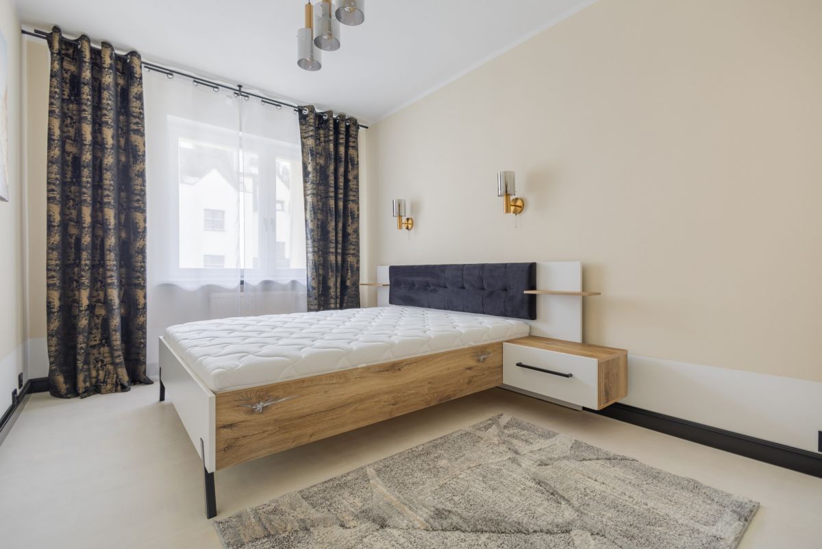 Jedna z trzech sypialni została urządzona i wyposażona w nowoczesne łóżko z materacem oraz komodę.