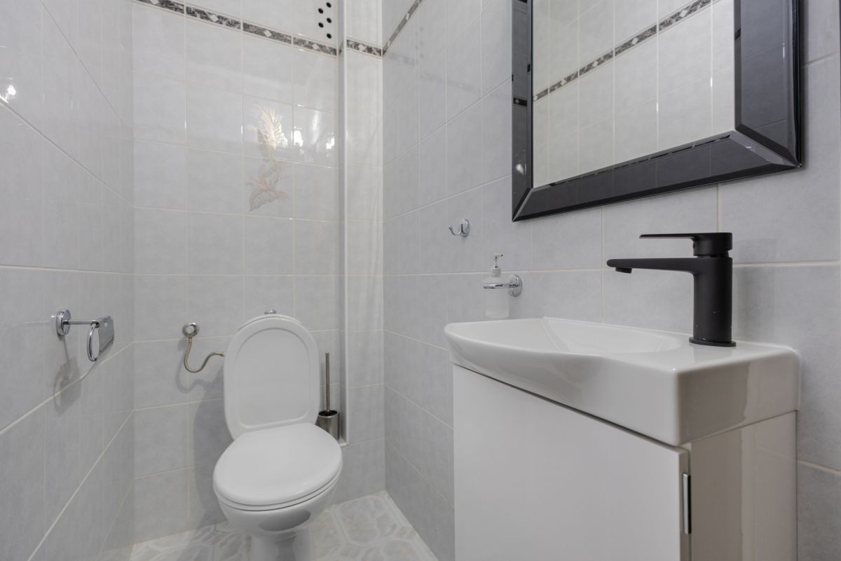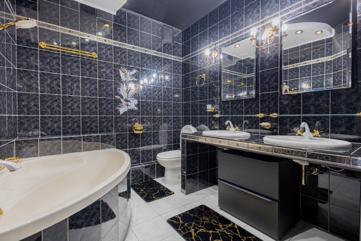 Przestronna łazienka z narożną wanną, dwiema umywalkami i eleganckim wyposażeniem. Mieszkanie posiada oddzielne WC. W łazience znajduje się pralka w kolorze czarnym firmy Indesit.