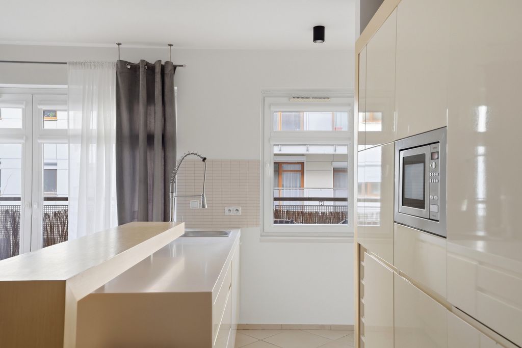 - Otwarta kuchnia z pełnym wyposażeniem: piekarnik, zmywarka, mikrofalówka i niezbędne sprzęty codziennego użytku