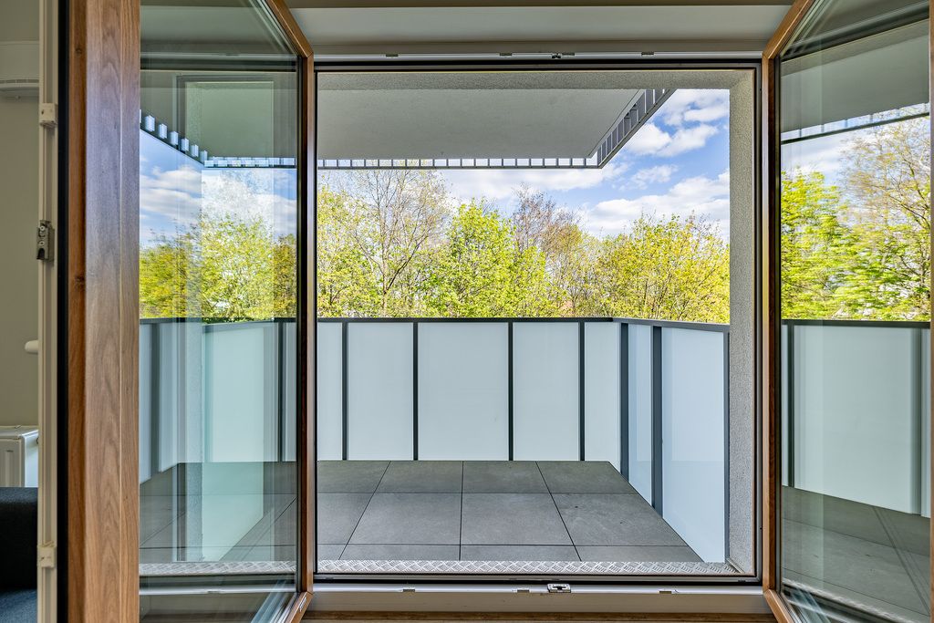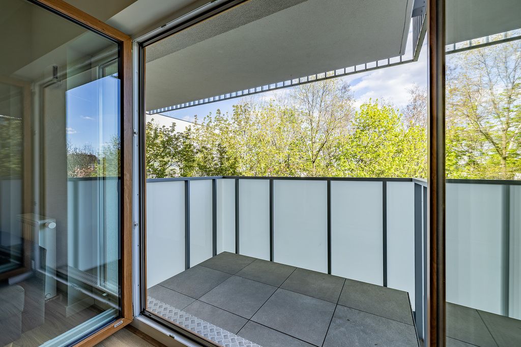 - balkon z widokiem na drzewa,