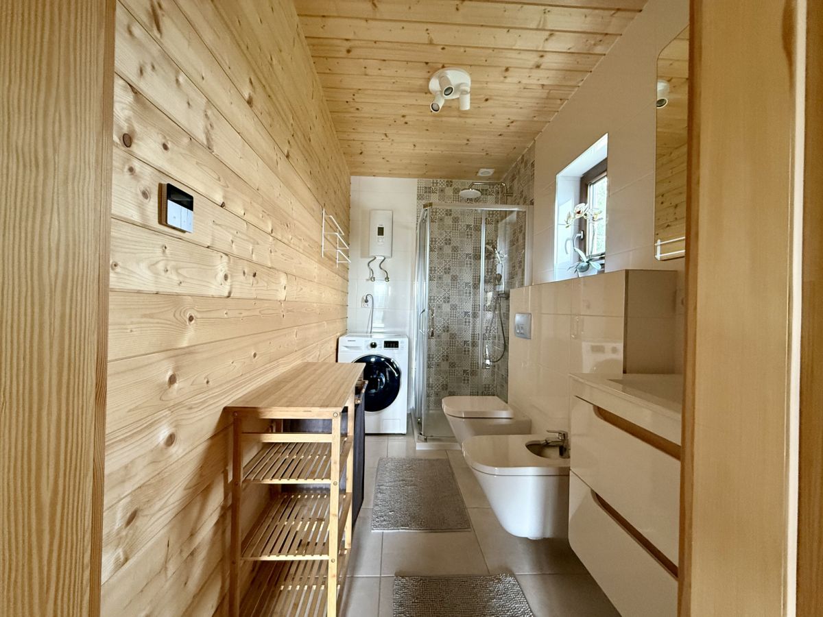 - Łazienka z kabiną prysznicową, bidetem, pralką,