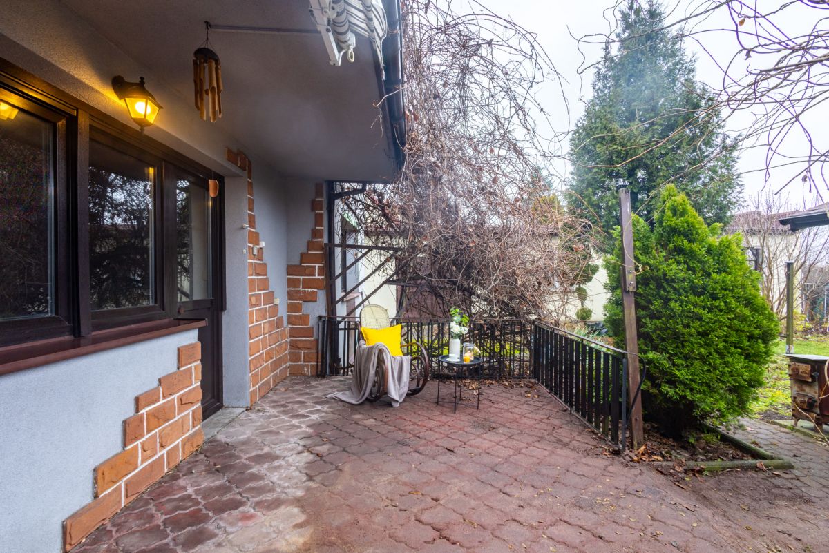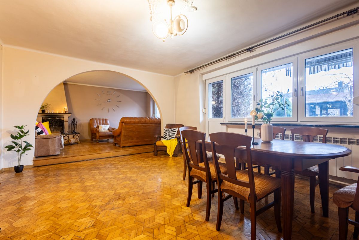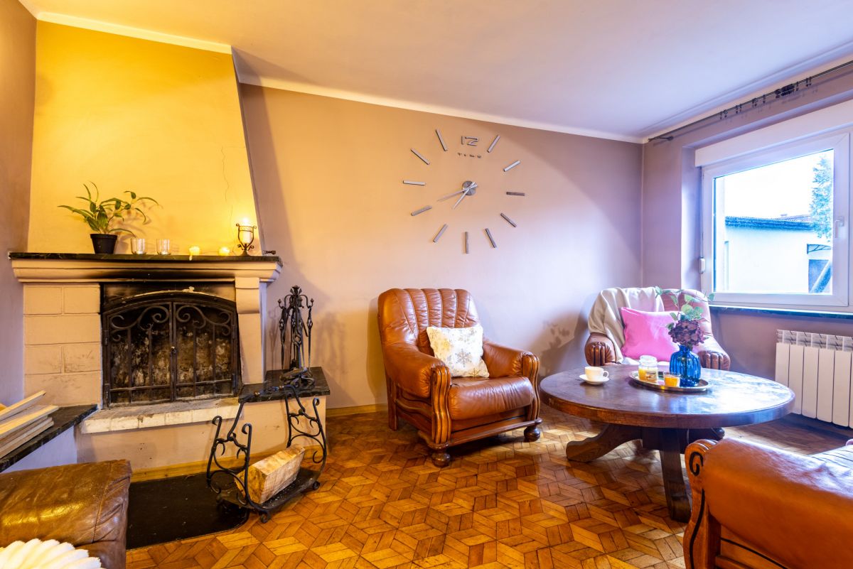 Sercem domu jest przestronny salon, w którym mieści się duży stół z krzesłami, kominek oraz stylowy skórzany zestaw wypoczynkowy, idealny do relaksu przy ogniu. Z salonu prowadzi wyjście na taras i zadbane podwórko, gdzie znajdziemy liczne nasadzenia.