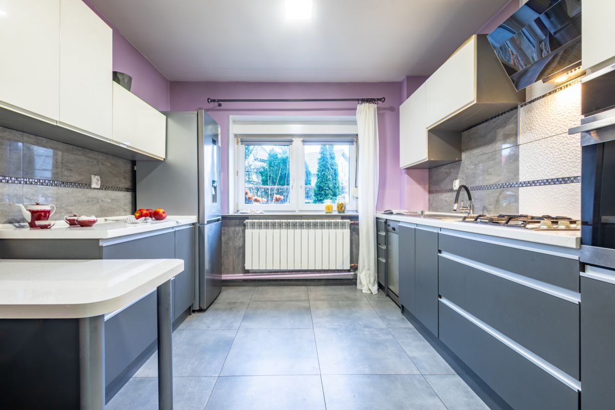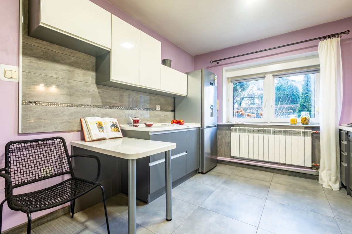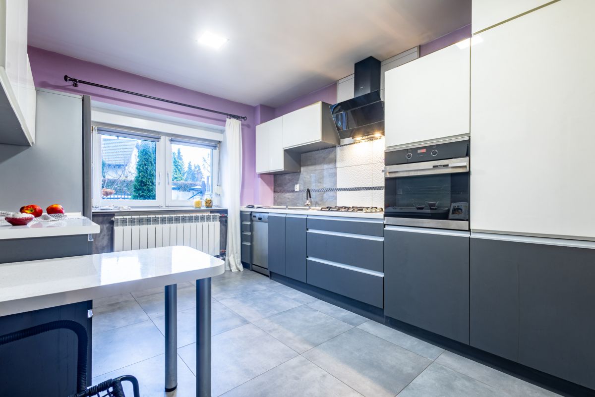 Do domu wchodzimy przez wiatrołap z obszerną szafą, który prowadzi do korytarza. Po prawej stronie mieści się niewielki pokój, idealny na gabinet lub miejsce do nauki. Dalej znajdują się schody na piętro oraz wejście do jasnej, w pełni wyposażonej kuchni - z piekarnikiem (Amica), kuchenką gazową, lodówką (Beko) oraz zmywarką (Whirlpool). Stonowane odcienie szarości dodają elegancji, a praktyczny schowek zapewnia dodatkową przestrzeń na przechowywanie.