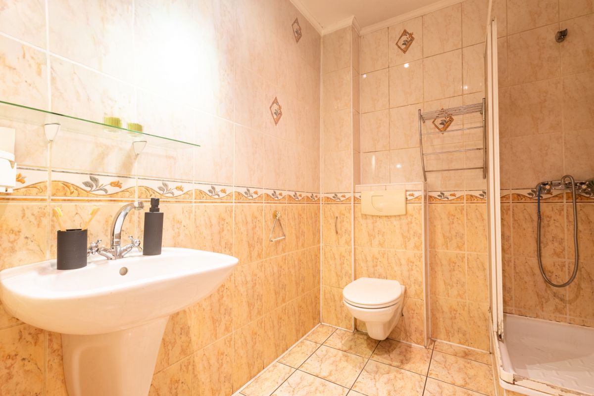 Na parterze dostępna jest również łazienka w neutralnych kolorach, wyposażona w prysznic i umywalkę.