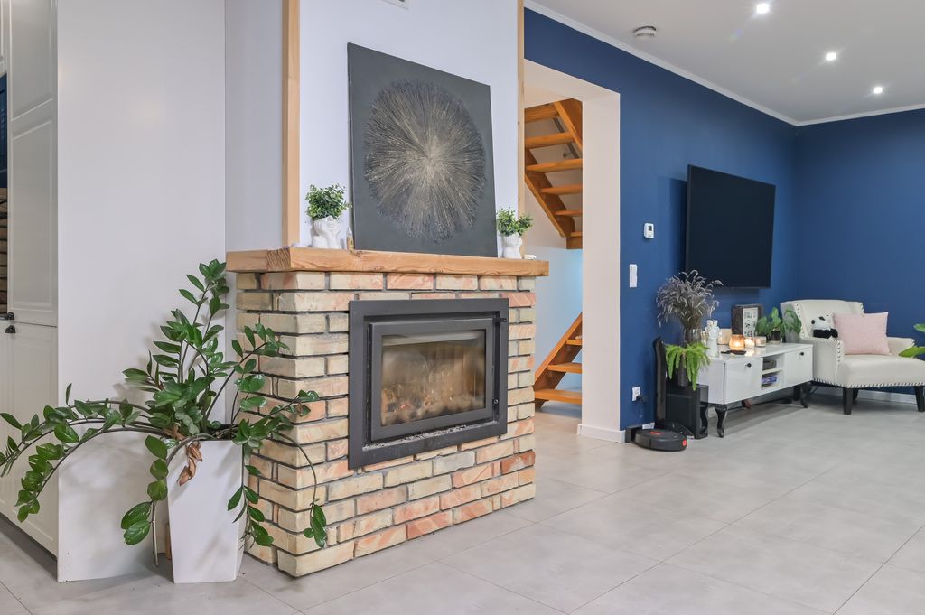 - Przestronny salon z otwartą kuchnią – jasny i pełen naturalnego światła, z dużymi przeszkleniami i wyjściem na taras w ogrodzie. To idealne miejsce na spotkania rodzinne, wspólne posiłki czy odpoczynek przy kominku.