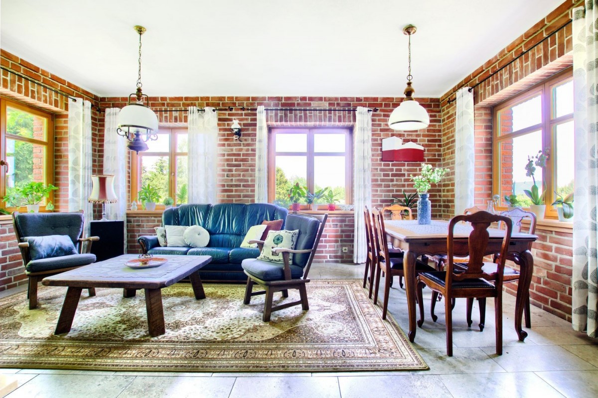 Został zbudowany metodą tradycyjną z cegły formowanej ręcznie. Każdy etap inwestycji był przemyślany o czym świadczy efekt końcowy. Wnętrza zostały wykończone drewnem, sufity i ściany modrzewiem, schody są dębowe, a drzwi sosnowe. Okna również są drewniane. Na podłodze trawertyn, cegła i deska.