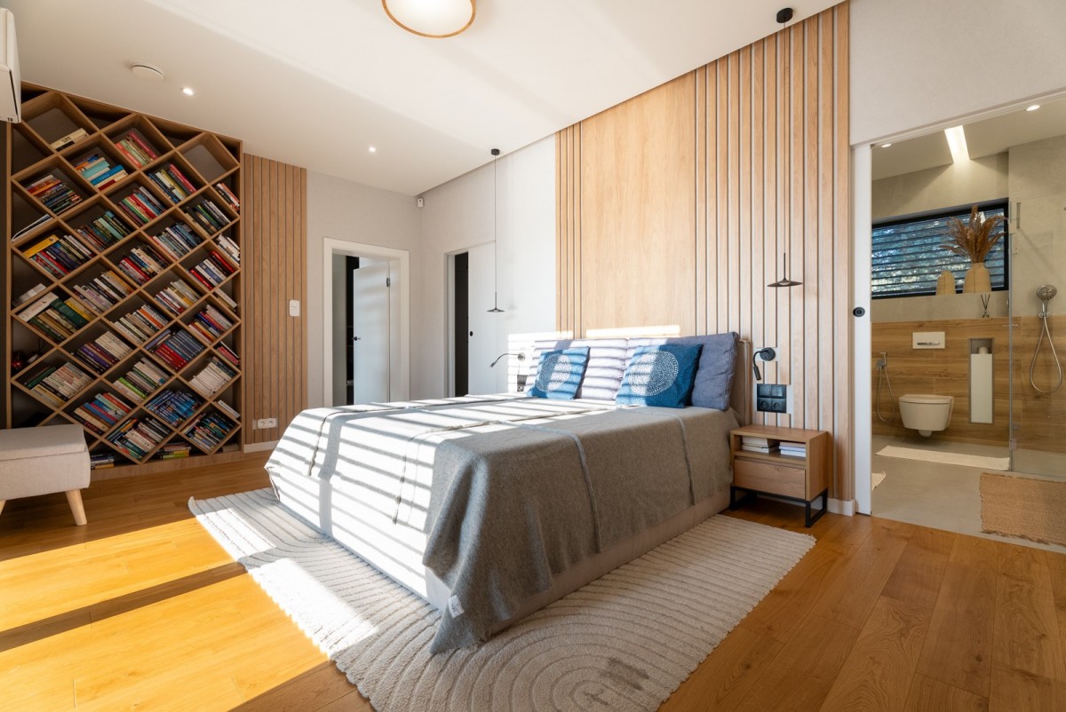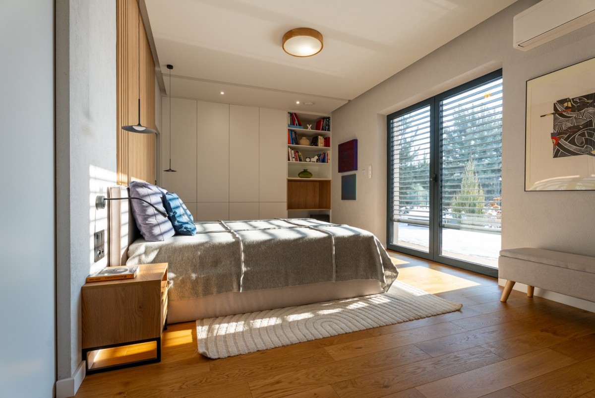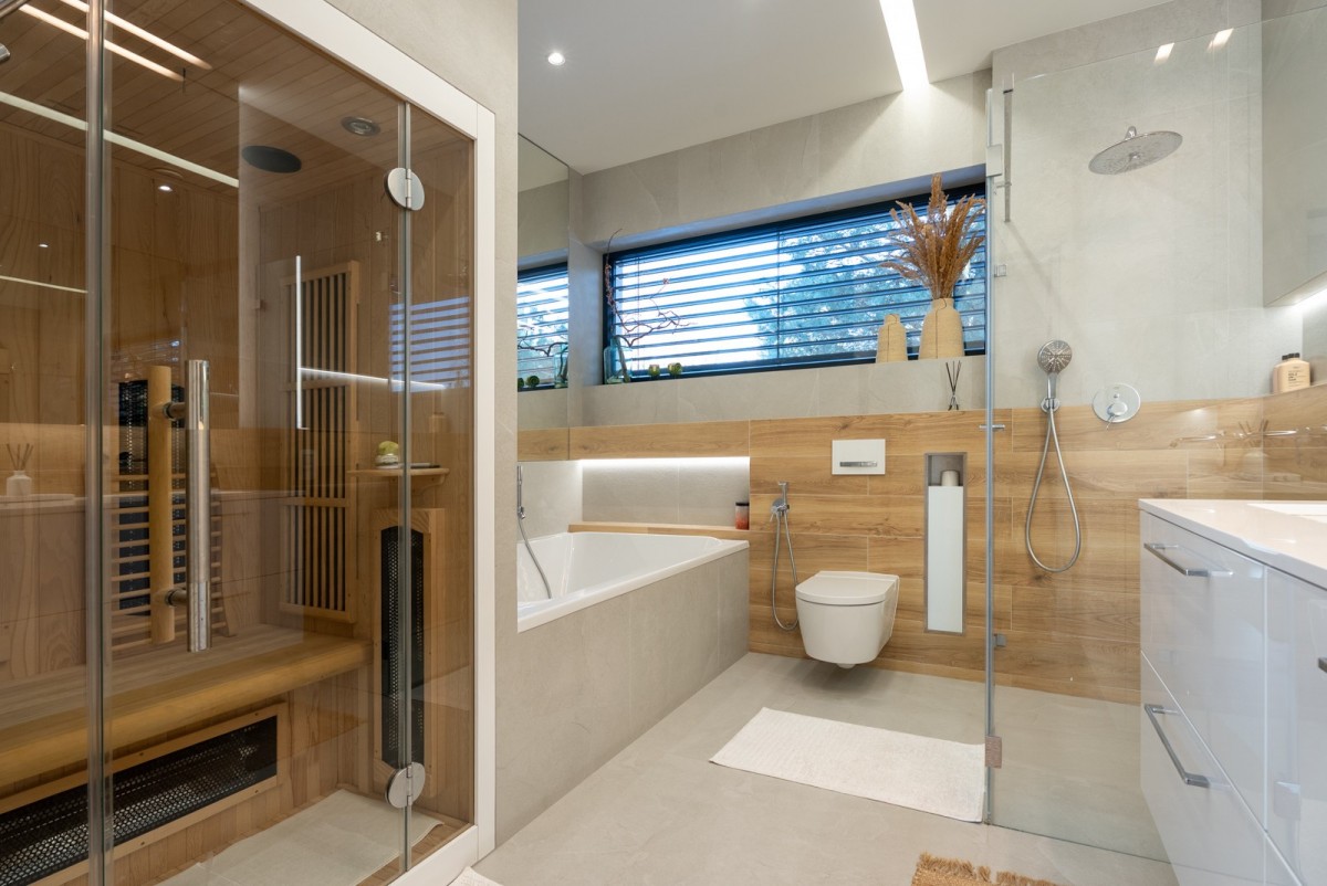 • Strefa prywatna to sypialnia główna z garderobą w pełnej zabudowie oraz prywatną łazienką typu SPA: ogromna wanna dwuosobowa, prysznic walk-in z deszczownicą, sauna infrared i dwie umywalki