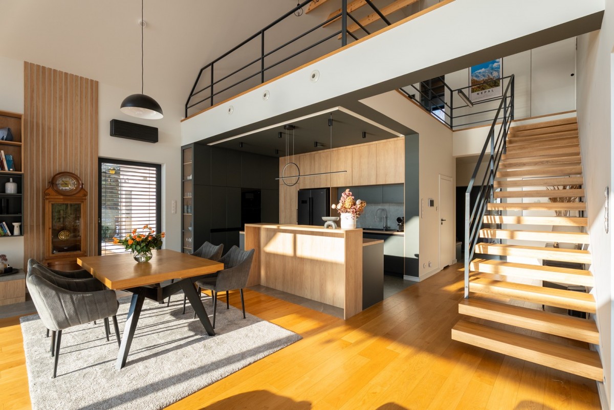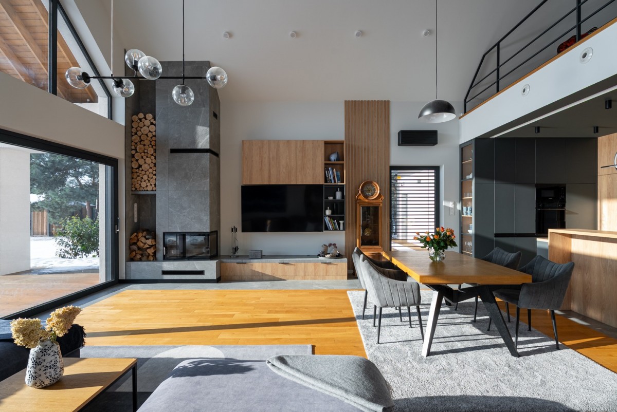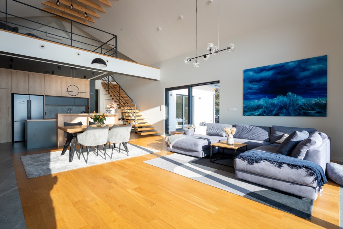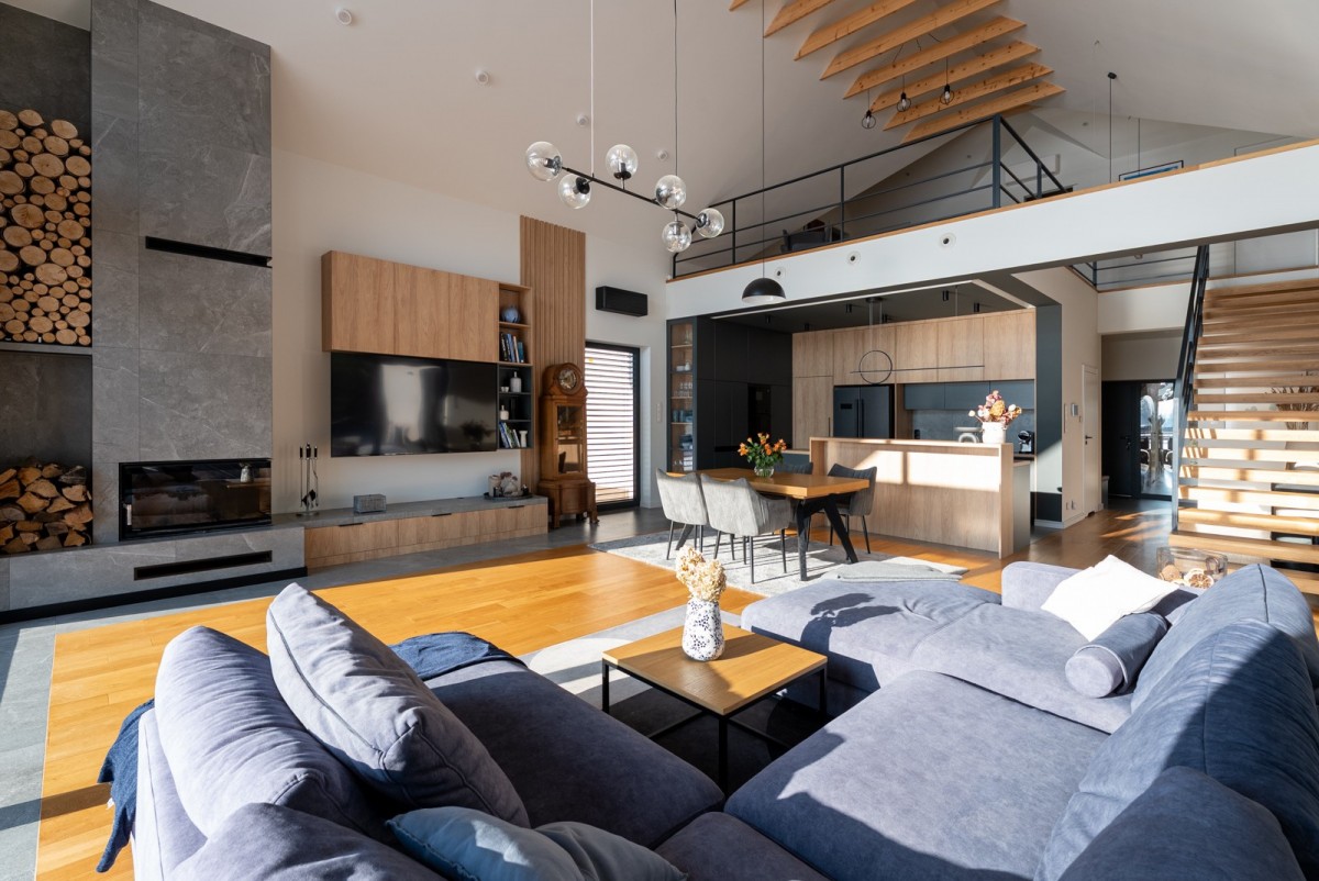 • przestronny salon z kuchnią, wysokość 7 m, z chłodziarką na wino i narożnym kominkiem - serce domu, doskonale doświetlone dzięki dużym przeszkleniom typu HS