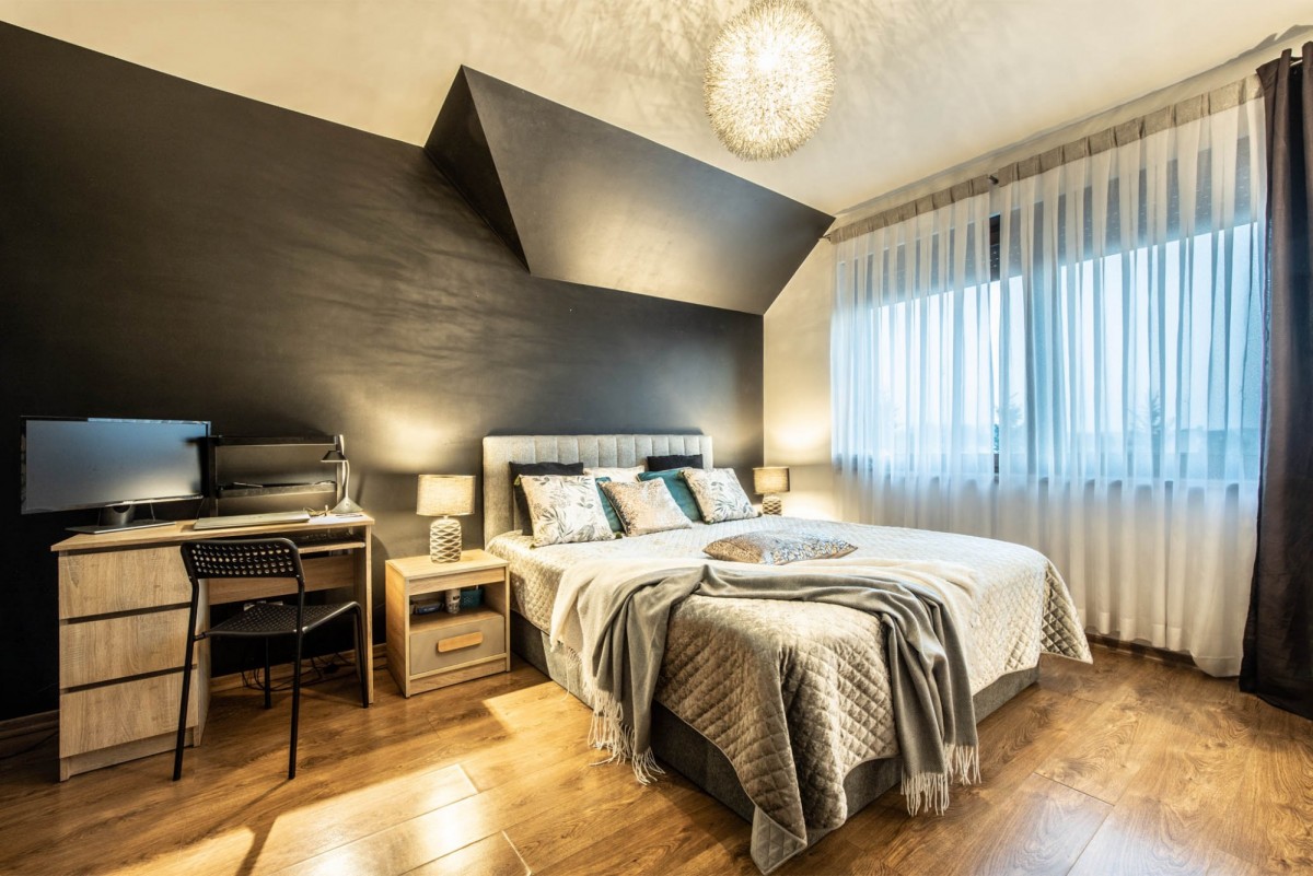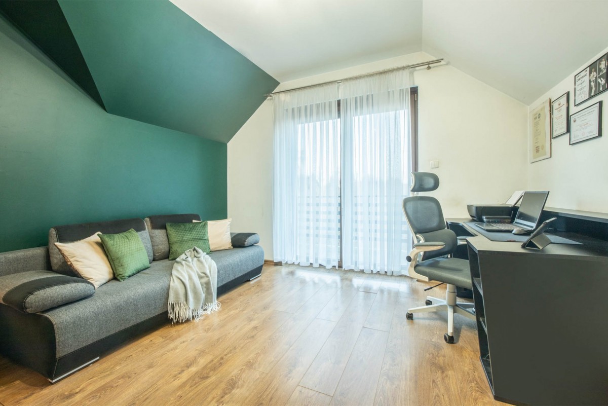 Na piętrze znajdują się trzy pokoje, każdy o powierzchni co najmniej 15 m², z pojemnymi garderobami - po minimum 10 m² każda, co sprawia, że przechowywanie odzieży staje się czystą przyjemnością.