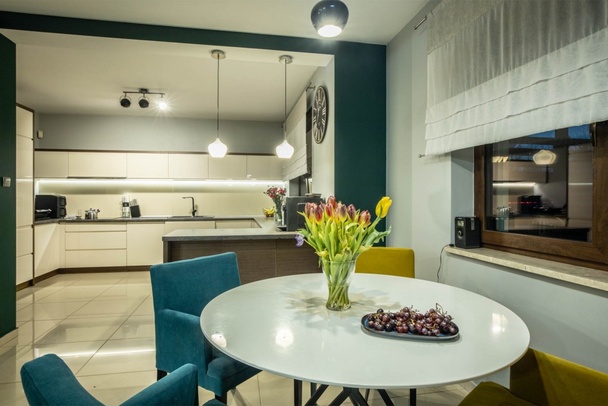Na parterze domu znajduje się duży, przestronny salon, idealny do codziennego wypoczynku oraz przyjęć. Kuchnia z jadalnią to prawdziwy atut - zaprojektowana w taki sposób, że pozwala na pełną swobodę gotowania, jednocześnie nie zakłócając spokoju domowego ogniska. Dzięki temu, nawet w przypadku niezapowiedzianych gości, bałagan pozostaje niewidoczny, a porządek - zachowany. Warto podkreślić, że wiatrołap w tej nieruchomości jest wyjątkowo przestronny, co ułatwia organizację codziennych spraw.