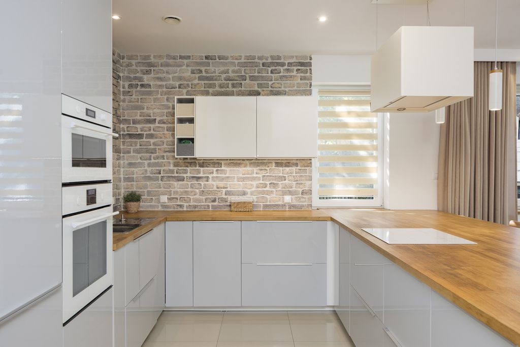 Kuchnia została wyposażona w meble w stałej zabudowie oraz sprzęt AGD. Duża wyspa kuchenna zapewnia dodatkową przestrzeń roboczą i stanowi praktyczne miejsce do wspólnych spotkań domowników.