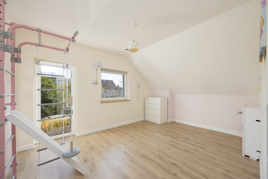 Ogród to kolejny ogromny atut tej nieruchomości – duży, zadbany teren z tylną furtką prowadzącą wprost nad rzekę i na pobliskie łąki, idealne na spacery i aktywny wypoczynek. Na działce znajduje się także domek dla dzieci, który zapewnia najmłodszym miejsce do zabawy na świeżym powietrzu.