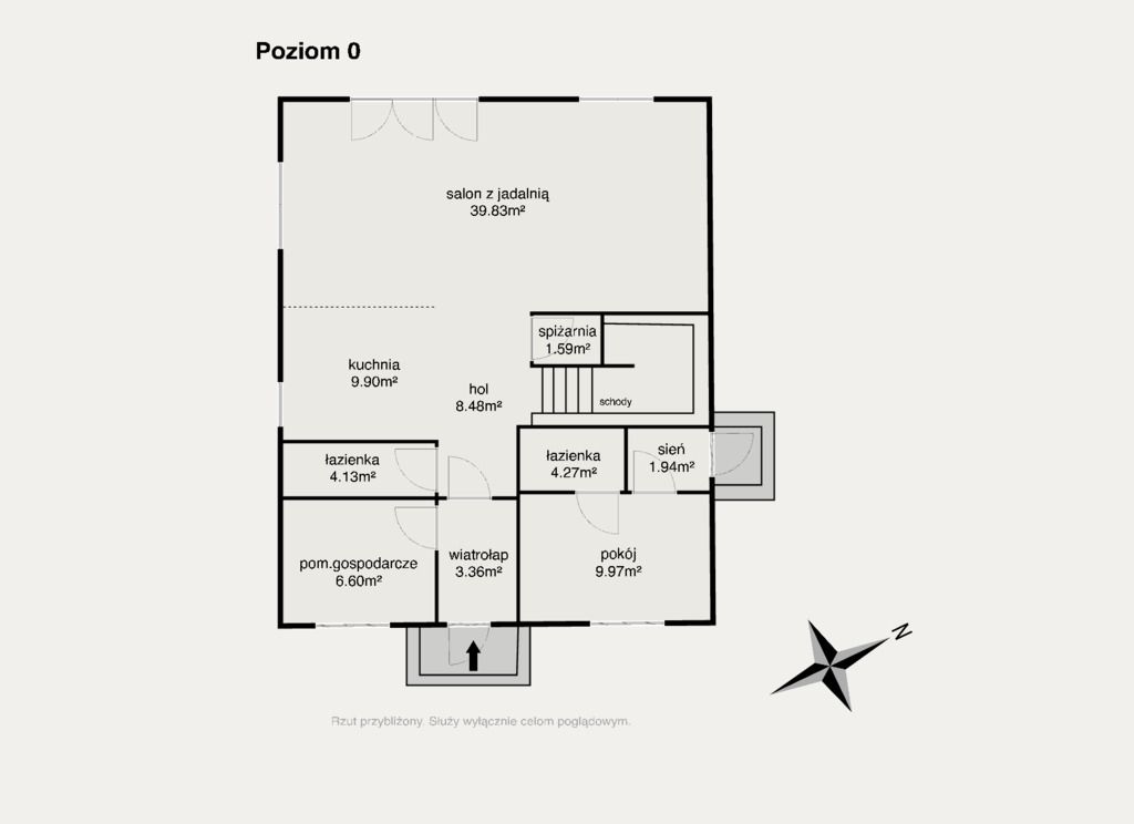 Dodatkowa część domu z osobnym wejściem może pełnić funkcję gabinetu, biura, przestrzeni pod wynajem lub niezależnego miejsca dla gości.