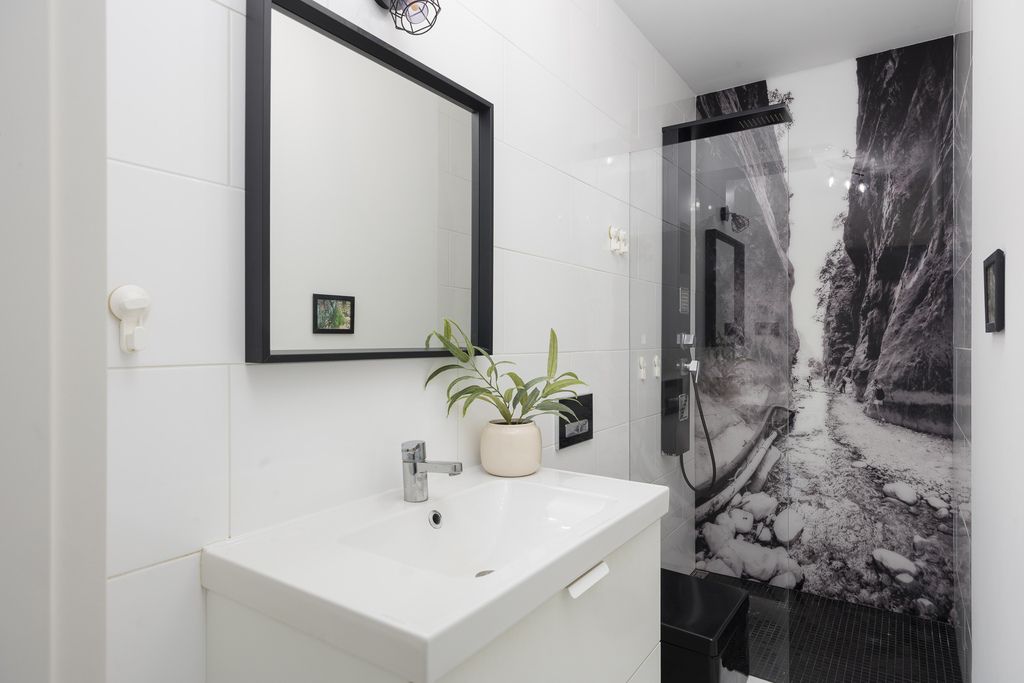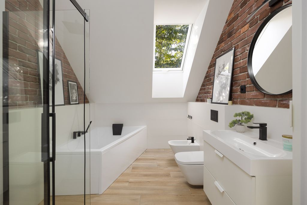 Łazienki zaprojektowano w spójnym, nowoczesnym stylu. Jedna z nich wyposażona jest w kabinę prysznicową, a druga zarówno w wannę, jak i prysznic oraz bidet.