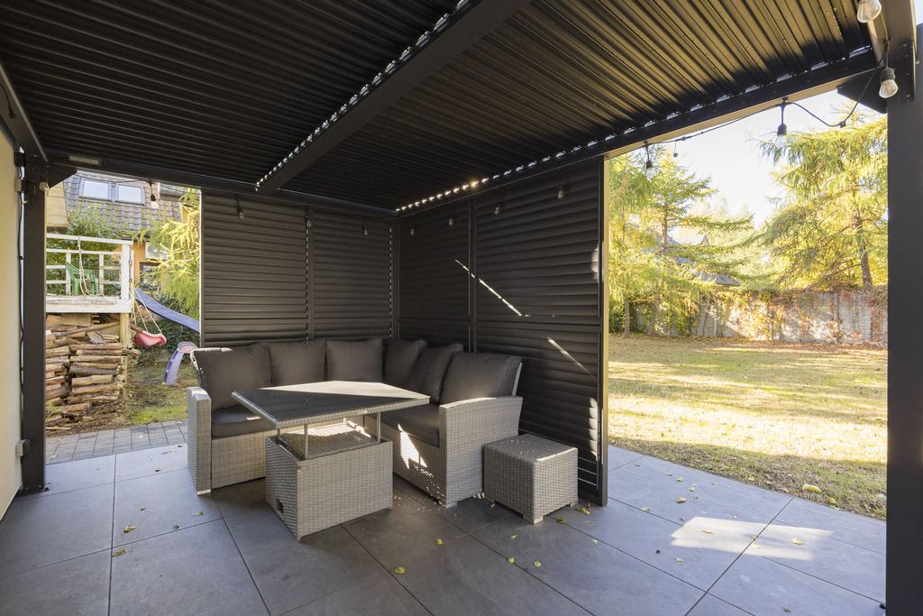 Strefa dzienna to przestrzeń typu open space łącząca kuchnię, jadalnię i salon. Panoramiczne przeszklenia doświetlają wnętrze i prowadzą bezpośrednio na taras. Taras wyposażony jest w pergolę z systemem regulowanych lameli, co umożliwia kontrolę nasłonecznienia i komfortowe korzystanie z ogrodu o każdej porze dnia.