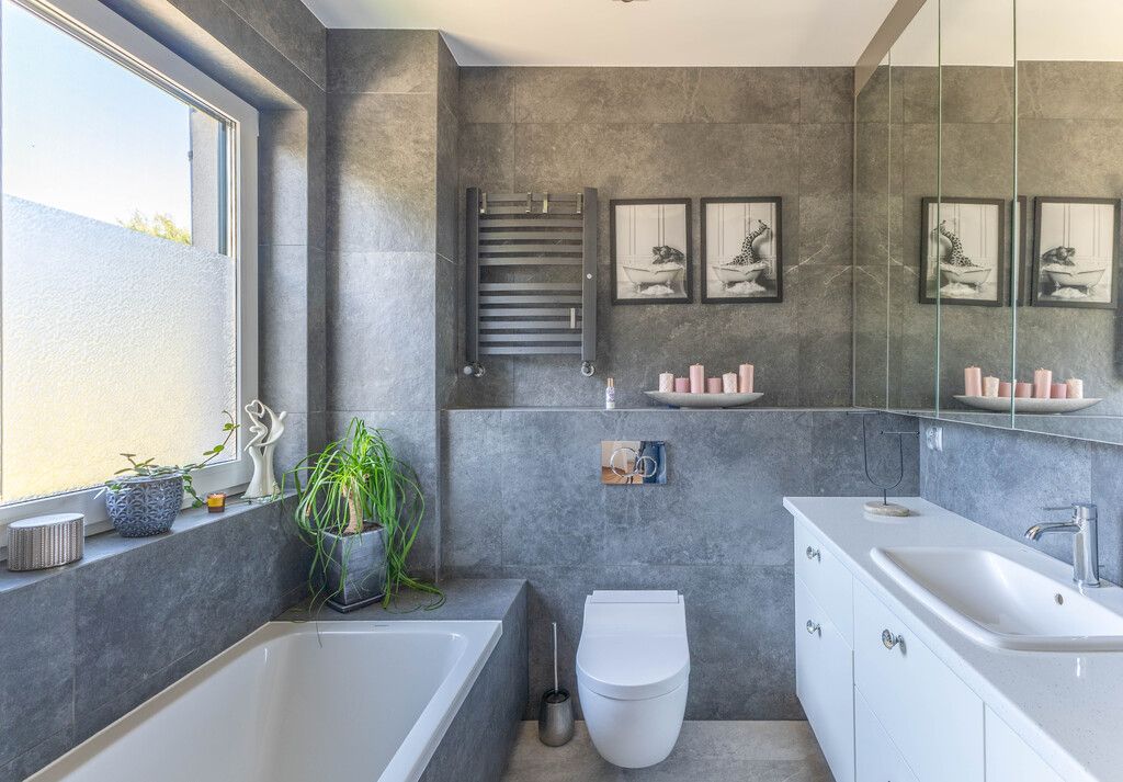 Piętro domu obejmuje trzy sypialnie oraz łazienkę z wanną.