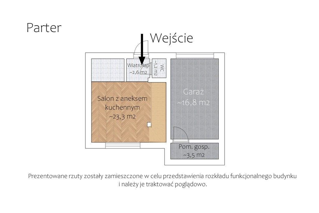 Na parterze znajduje się salon z dużymi przeszkleniami, zapewniającymi doskonałe doświetlenie wnętrza. Z salonu prowadzi wyjście na taras, stanowiący idealne miejsce do relaksu. Kuchnia została zaprojektowana z dbałością o detale, dodatkowo oferując funkcjonalną przestrzeń do przygotowywania posiłków.