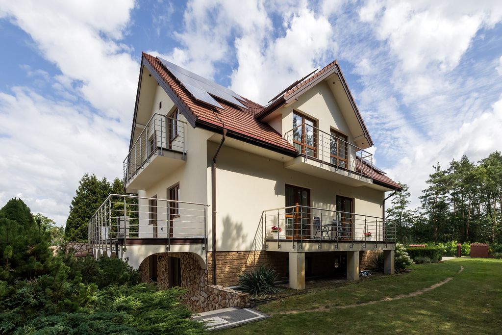 Dach: dachówka ceramiczna, pełne deskowanie, izolacja termiczna 15 cm, panele fotowoltaiczne pokrywające całe zapotrzebowanie na energię elektryczną