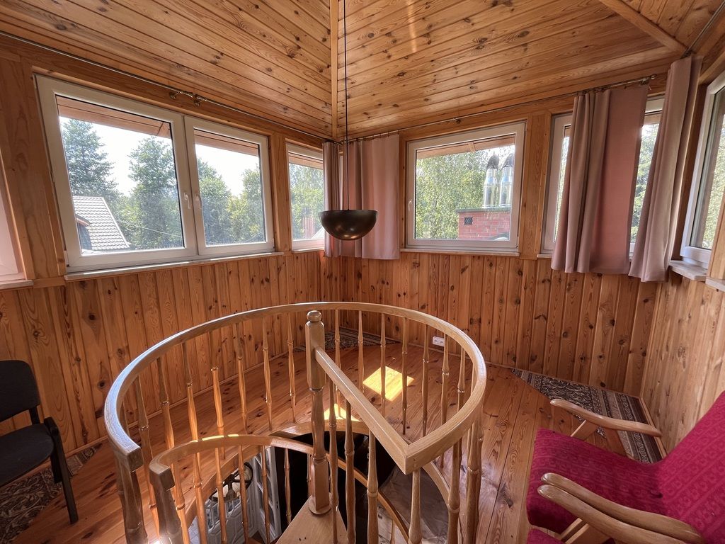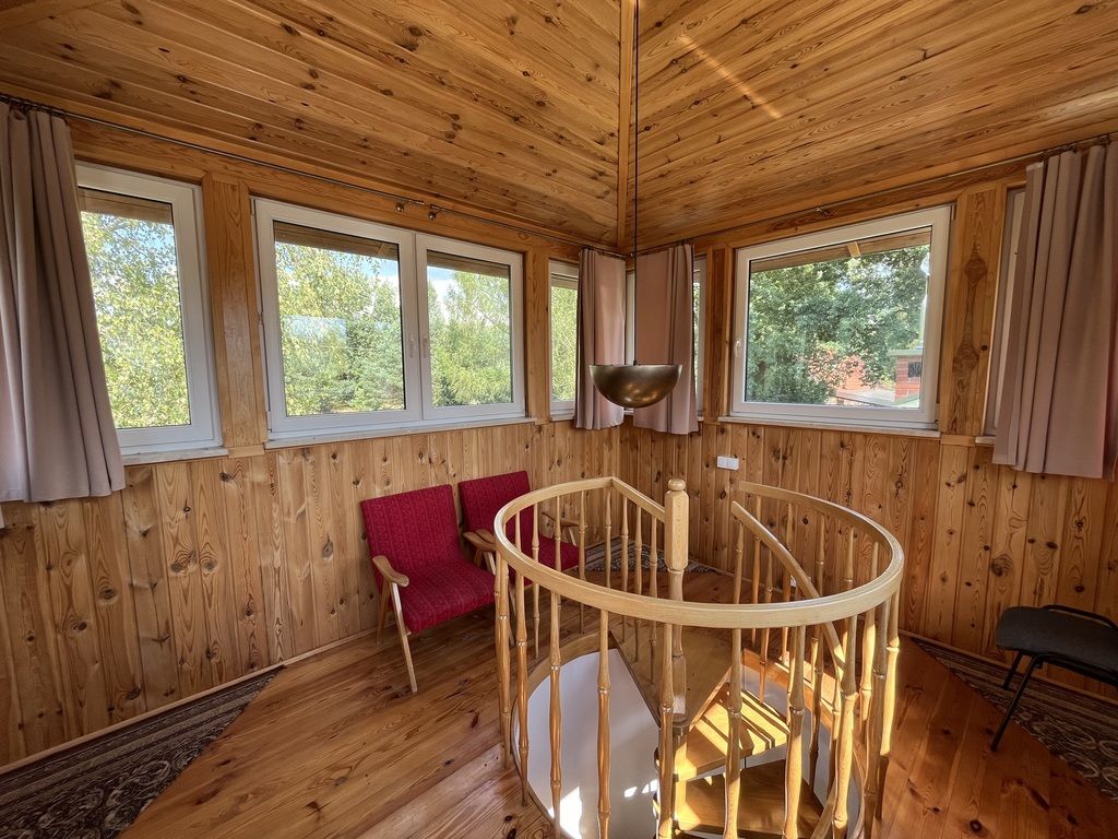 -w jednym z budynków w środkowej jego części znajdują się drewniane schody prowadzące do pomieszczenia na piętrze. Pomieszczenie w kształcie regularnego wielokąta z oknami skierowanymi na wszystkie strony świata. Pomieszczenie to sprawia wrażenie "bocianiego gniazda". Idealne miejsce do relaksu i odpoczynku jak również do zabawy dla dzieci.