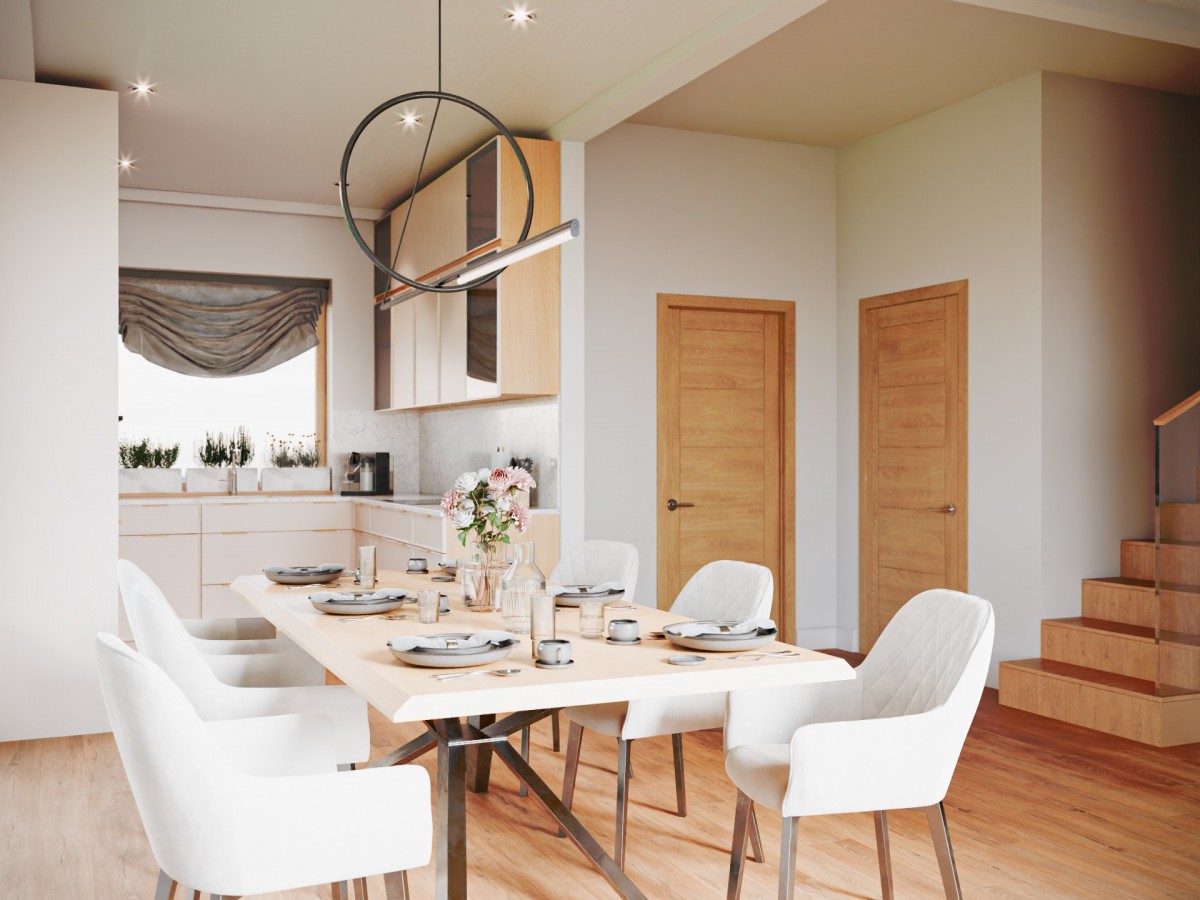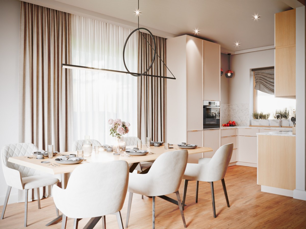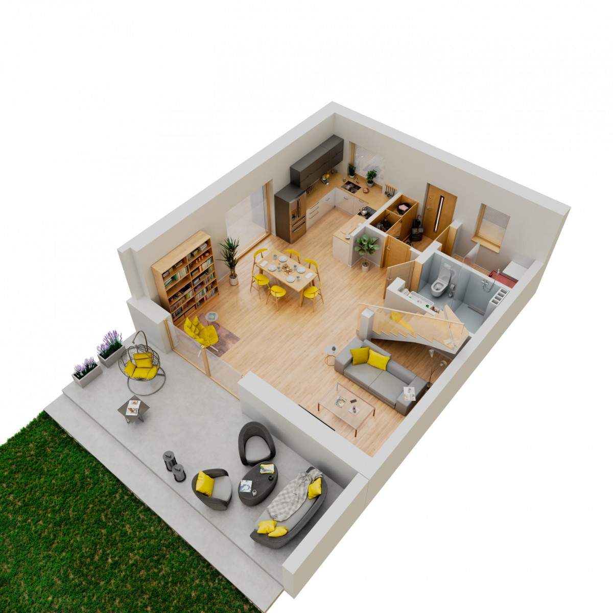 - przestronny salon z dużym oknem przesuwnym i wyjściem na taras wraz z jadalnią (29,33 m2)